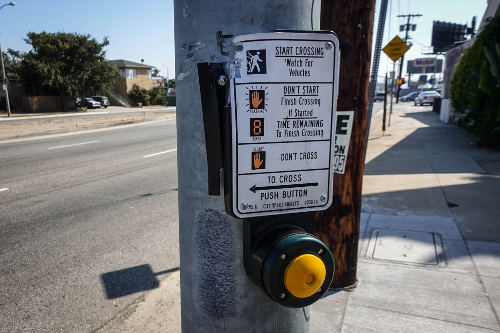 5. Пошли гулять! Тут каждая более менее крупная улица - почти шоссе. Надо нажать кнопочку, и ждать пока светофор решит тебя пропустить. У нас в НЙ можно всегда перебежать, пока машин нет, но в Калифорнии машин больше, они тут главные, так что пешеходы научились их уважать. Нажимаем, ждём.