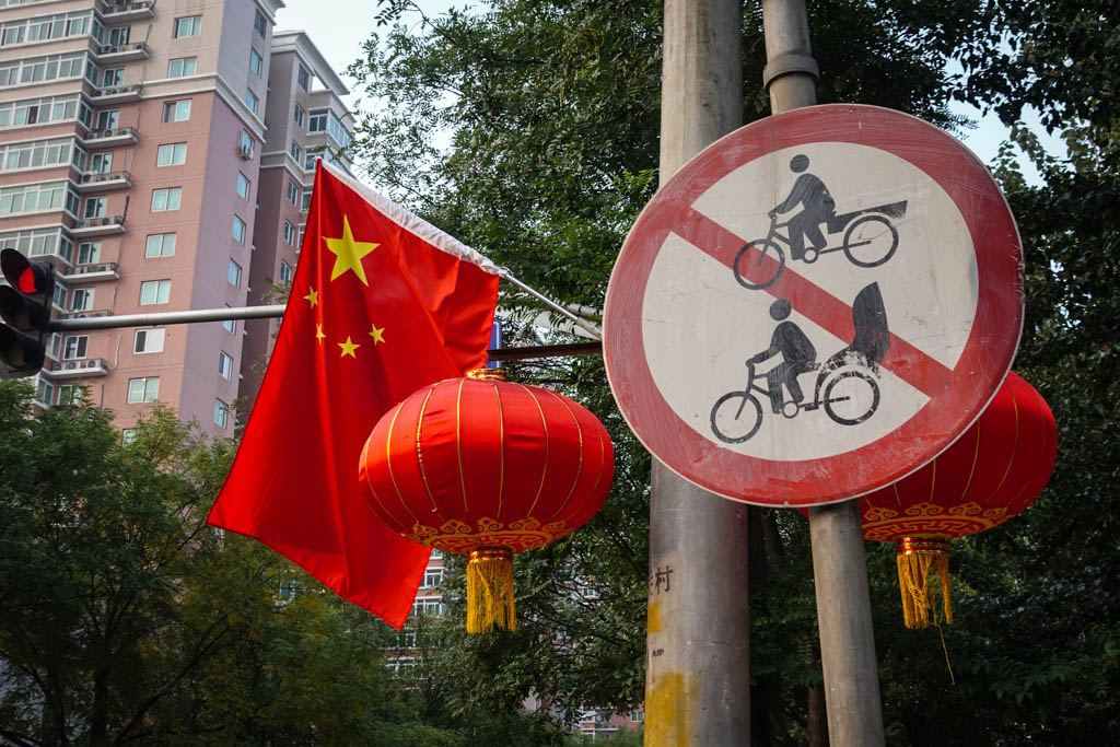 3. В Пекине нынче праздник: годовщина основания великой Китайской Народной Республики. А тут ещё и съезд мудрых деятелей Коммунистической Партии Китая проходит прямо сейчас. Из-за этого по всему городу вывешены красные флаги с китайским созвездием.