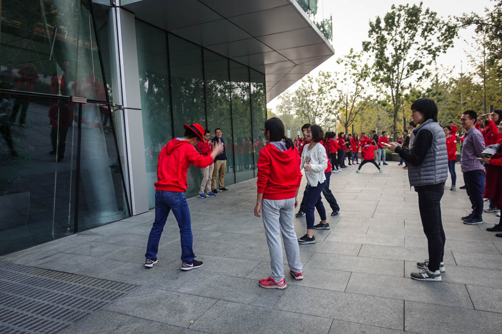 14. Удивительная вещь. Сотрудники компании Red Hat вывалили на улицу возле бизнес-центра, где расположен их офис, и устроили тимбилдинг. Группы по три-четыре сотрудника кидают на головы друг друга красные федоры с логотипа компании!