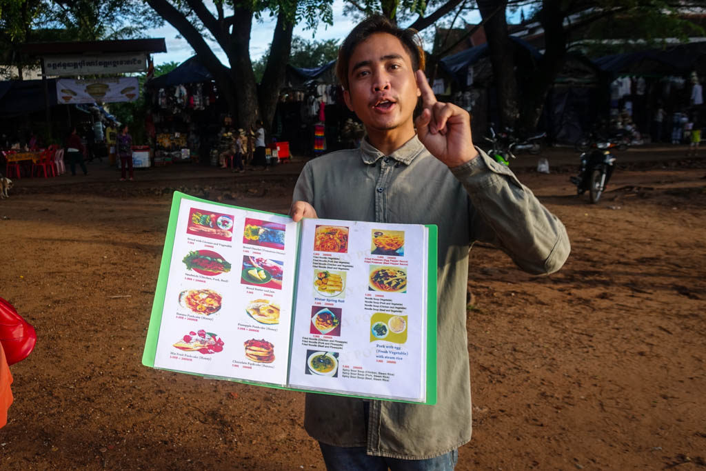 Мой вам совет: если вы действительно собираетесь там есть, то сначала проявите к этому меню интерес, но потом притворитесь, что вы не голодные. Отойдите в сторонку, подальше от других туристов, но так, чтоб зазывала пошёл за вами. Когда другие иностранцы уже не будут слышать, ваш настойчивый знакомый начнёт спускать цену. Сначала скажет, что за $5 угостит вас и кофе тоже. А потом и вовсе собьёт цену до четырёх, трёх, и даже двух долларов. Я действительно был не голоден, и на этом месте ушёл слишком далеко, чтоб за мной продолжать гнаться. Так что я не знаю, можно ли там поесть за доллар. Но за два - абсолютно точно.