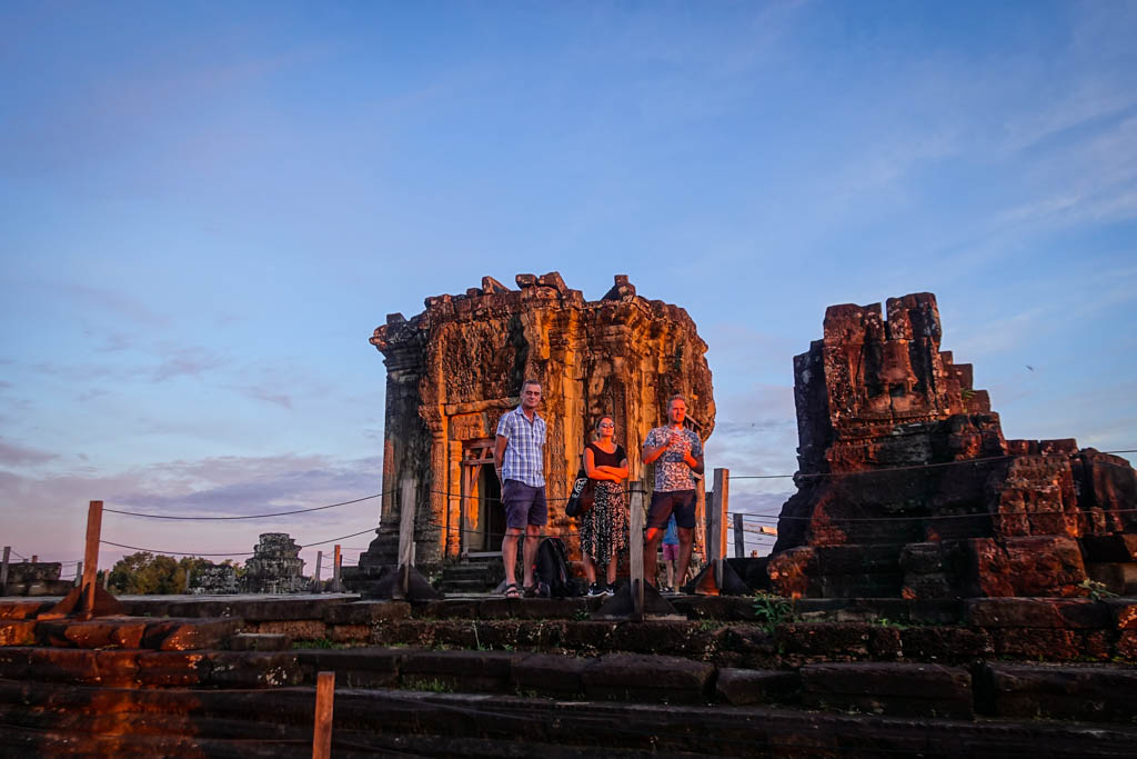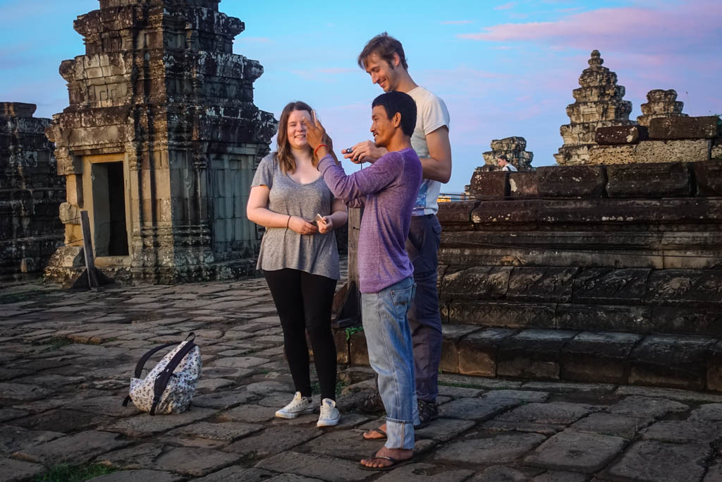 13. Вот эта пара англичан притащили наверх своего гида, который долго показывал им вооон туда, пока они тоже не разглядели крохотную башенку Ангкор Вата вдали. После этого парень попросил гида сделать фотографию их на фоне предрассветного неба. Я краем глаза посмотрел на крохотную любительскую мыльницу, которую тот принёс для съёмки. "Скорее всего ничего хорошего из этого кадра не выйдет," подумал мой непонятно откуда взявшийся внутренний фото-сноб.