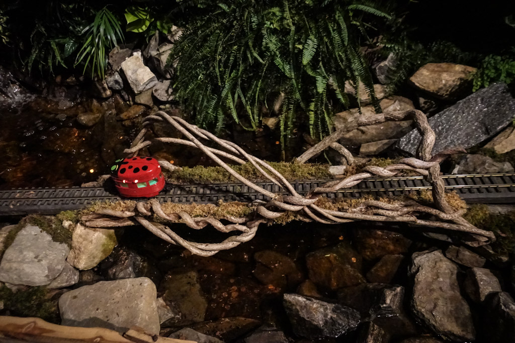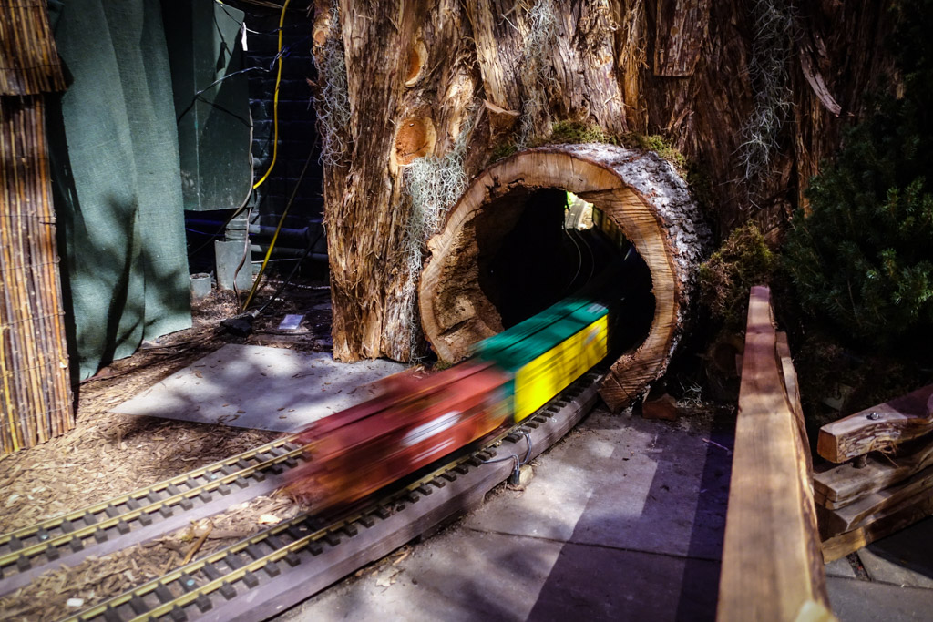 16. Ландшафт весь тоже сделан из найденных кусочков дерева, растений, и т.д. Один пень служит аркой над железнодорожными путями.