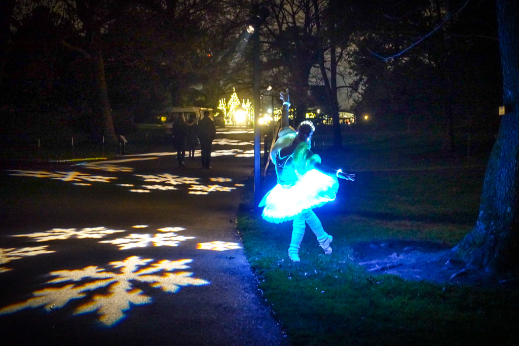 3. Центральную аллею подсвечивают снежинками, вдоль неё гостей встречают сказочные персонажи, разодетые в светящиеся наряды, прямо как участники фестиваля Burning Man ночью.
