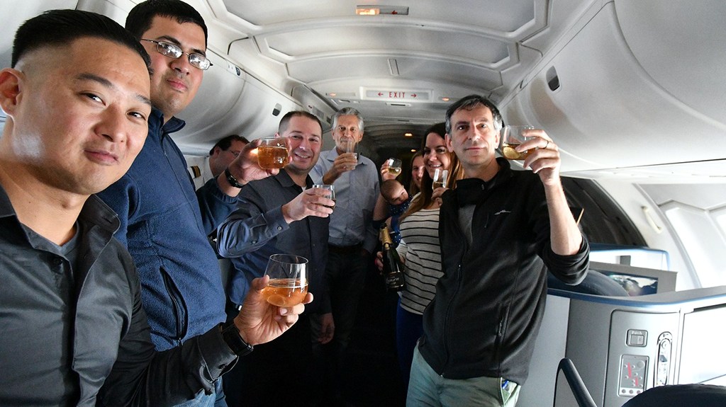 В США нашлось достаточно авиаэнтузиастов, которые готовы были специально полететь в Сеул лишь для того, чтоб занять место на последнем рейсе американского 747. Я уже вижу, как вы закатываете глаза. Это довольно особенные люди, настоящие фанаты. Их не смутил тот факт, что Дельта несколько раз меняла дату последнего рейса - сначала на 19е, а потом на 18е. Большинство из них просто поменяли билеты на нужный день, чтобы оказаться на борту этого самолёта. Вот они, эти безумцы - поднимают тост за уходящую Королеву Небес.