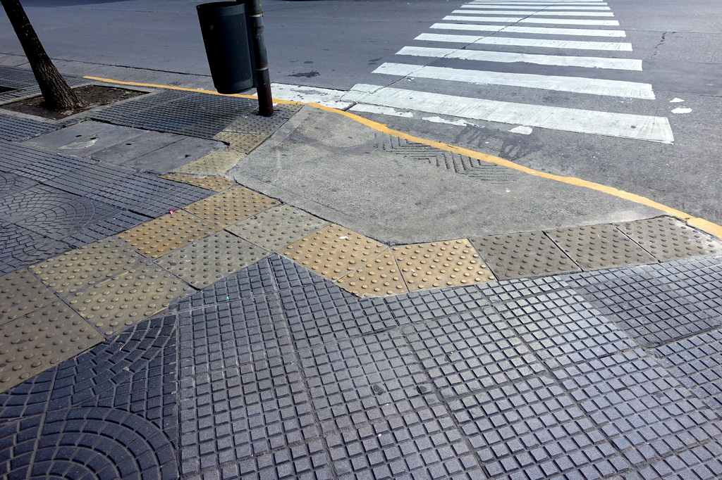1. Но для слепых пешеходов, передвижение по улицам города должно превращаться в сенсорный праздник. Как известно, люди лишённые зрения используют палочку, чтобы нащупывать окружающий мир. Для них перекрёстки специально оборудованы тактильной плиткой: ощущая эту текстуру, человек лучше ориентируется в городском пространстве. И в Буэнос-Айресе такая плитка есть на всех перекрёстках.