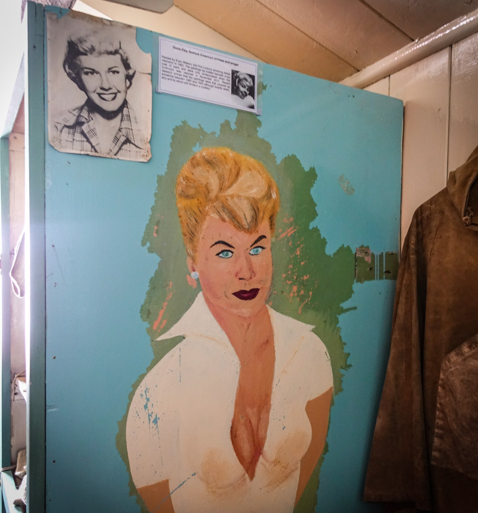 18. Очевидно, работа Эванса пользовалась спросом у его товарищей по экспедиции, потому что он разрисовал знаменитыми девушками почти все стенки жилых помещений. Вот, например, британская актриса 50х, Диана Дорс.