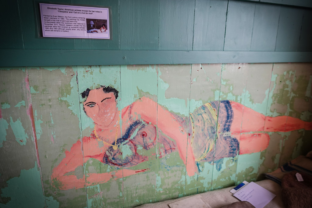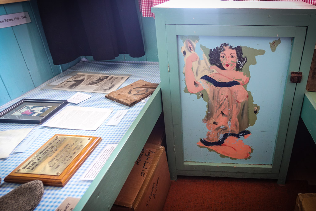 16. Сравнительно недавно, обнаружилось, что на этих стенах около 30 лет были спрятаны потерянные шедевры. Во время реставрационных работ в 2011 году был снят верхний слой голубой краски, и под ним обнаружились рисунки знаменитых пинап-моделей 1950х годов. Автором этих произведений антарктического искусства был дизельный механик, Эван Ватсон, который зимовал на станции в 1960 году. Где-то в 1980м эти стены были закрашены, и рисунки исчезли на десятилетия.