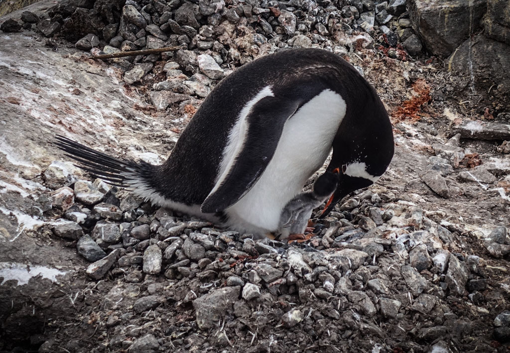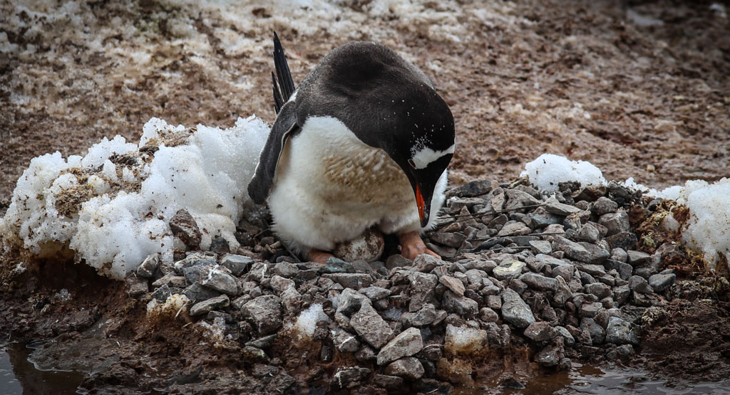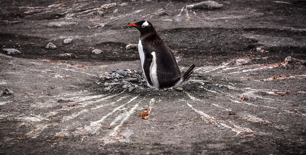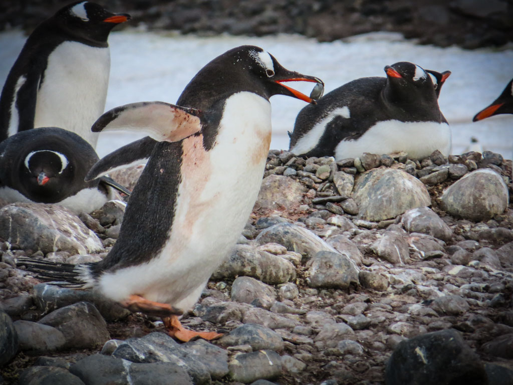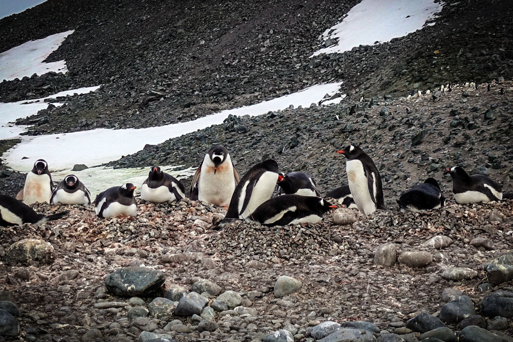 В этих колониях они строят гнёзда из камушков, и высиживают своё потомство. Есть несколько видов пингвинов, которые гнёзд не строят (это королевские и императорские пингвины), но мы их не видели. Папуанские пингвины (по-английски - Gentoo), которые попадались нам в самом большом количестве, ещё как строят гнёзда.