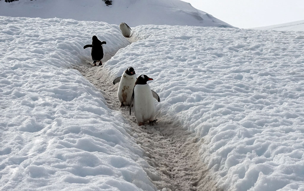8. Пингвины придерживаются этих протоптанных путей, чтобы не сбиться с дороги, и не провалиться случайно в снежную яму. Они ходят по этим тропам гуськом, но если надо, то можно разойтись с идущим навстречу.
