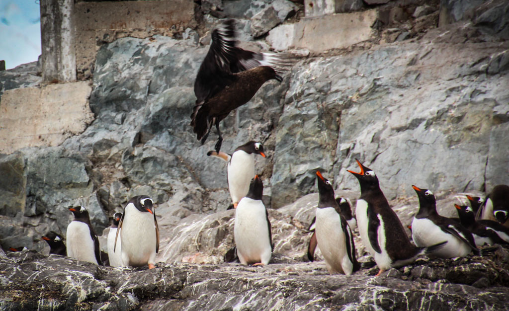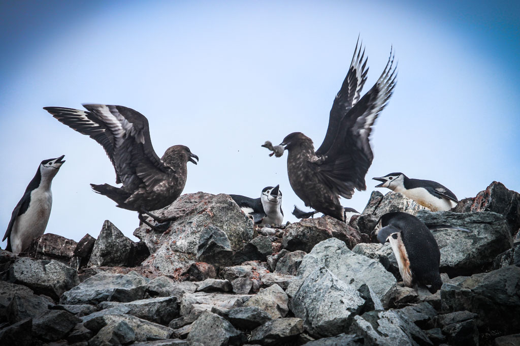 21. Родители продолжают дежурить в гнезде и защищать своё потомство ещё несколько недель после их рождения, пока птенцы не окрепнут. Это неспроста - над колониями постоянно кружат поморники и прочие хищные птицы, которые высматривают, кто там плохо лежит. Периодически они ныряют к земле, в надежде ухватить что-нибудь вкусненькое: яйцо или молодого птенца. В таких случаях пингвины, которые чувствуют опасность для своих гнёзд, начинают громко верещать, чтоб отогнать хищника. Но каждый защищает только своё собственное гнездо и потомство. Тем, что находятся хоть полметра в стороне уже пофиг.