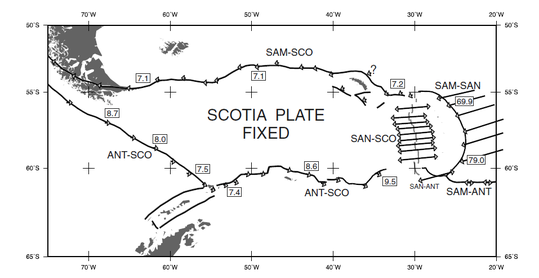 Однако где-то 80 миллионов лет назад в этом районе образовалась новая тектоническая плита, Скотия. Она начала искажать линию гор, проталкивая её центр всё дальше на восток. Если посмотреть на карту морского дна, то очертания растянутого хребта отлично видно: