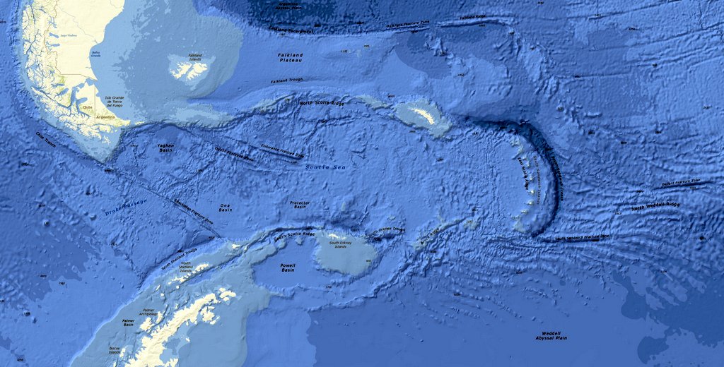 Но на этой карте есть ещё один прекрасный пример тектонической активности, который легко заметить невооружённым глазом. Это разрыв между южным кончиком Патагонии, и северной частью Антарктического Полуострова.