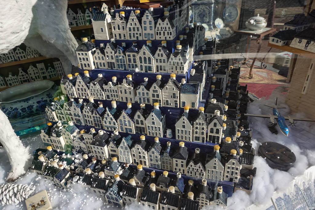 33. В одной из витрин огромная коллекция фарфоровых домиков, которые KLM выдаёт пассажирам в бизнес-классе. Представляете, сколько денег было потрачено на авиабилеты, чтоб построить такую пирамиду!