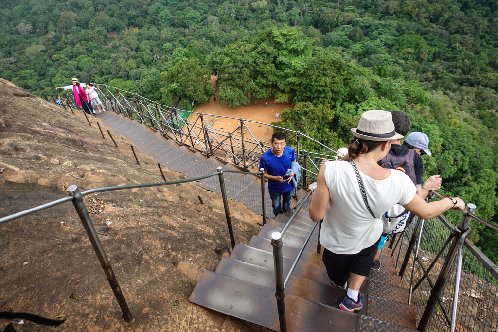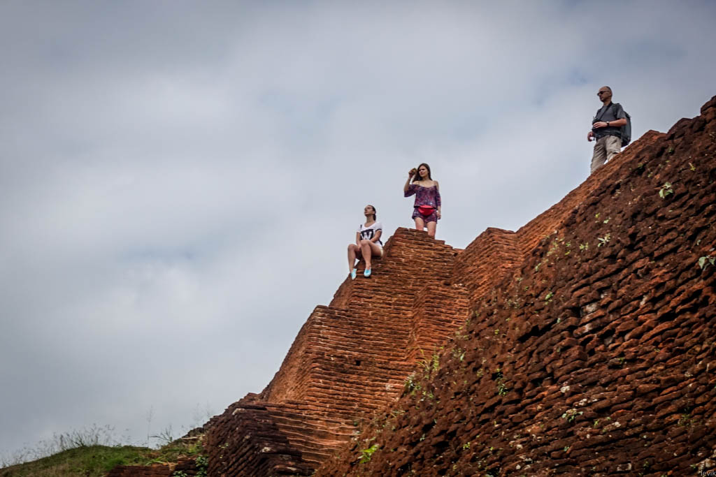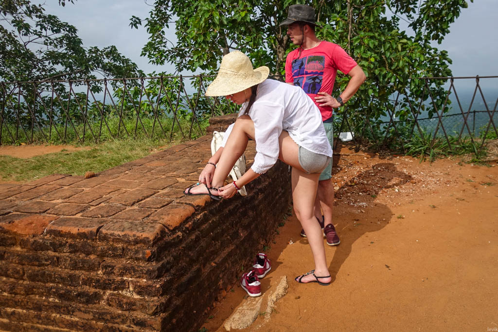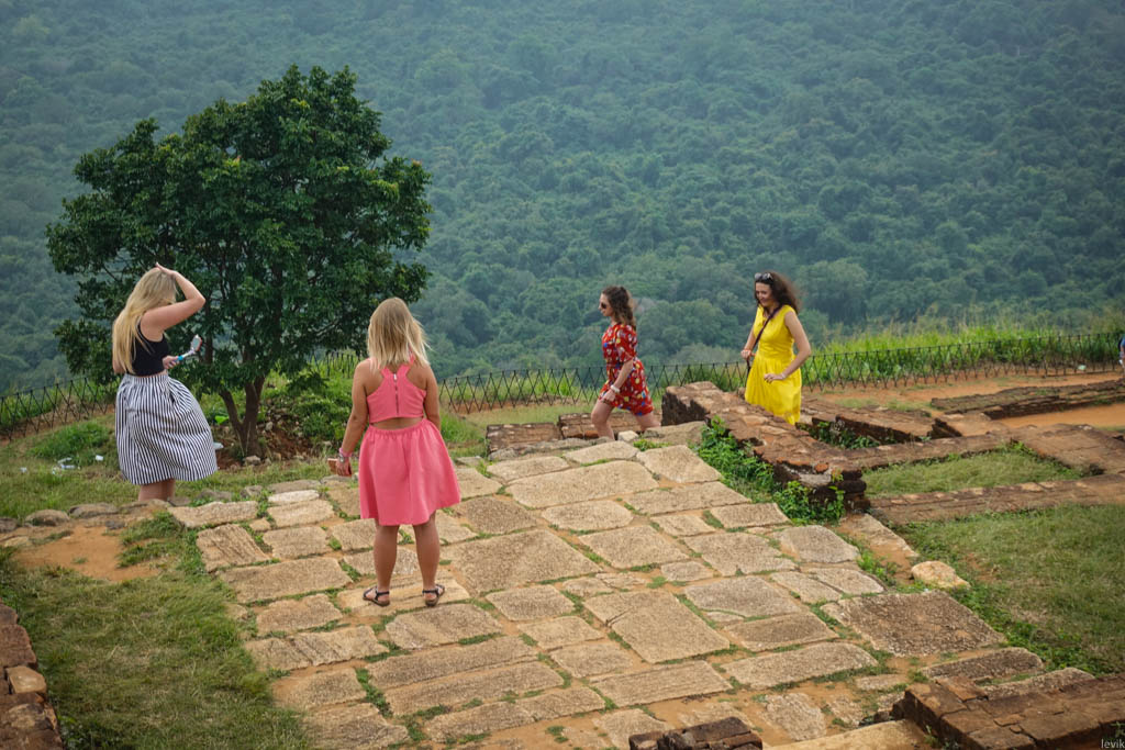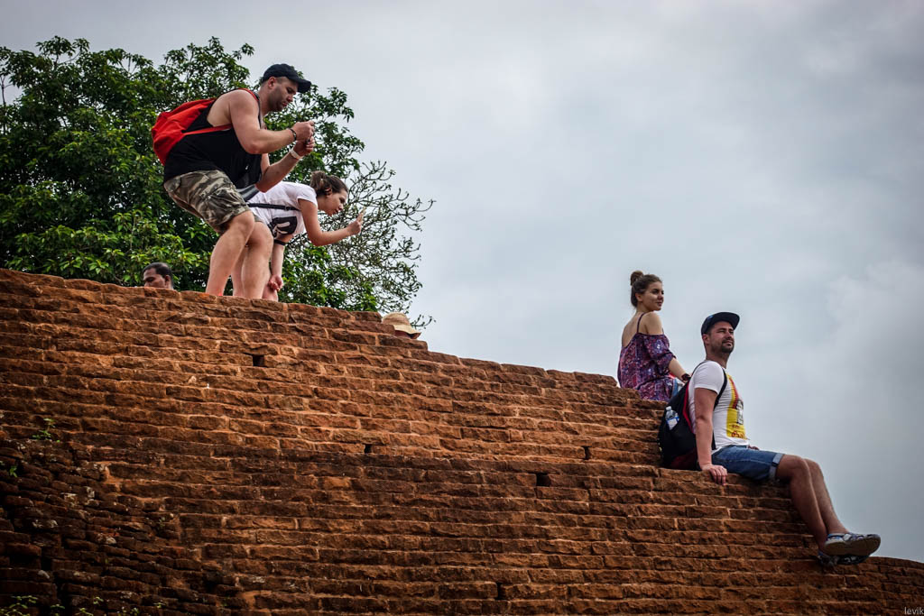 39. Пара слов о туристах. Подъём на вершину Сигирии довольно крутой, занимает минут сорок, а погода, даже рано утром, мягко говоря тёплая. Так что большинство посетителей поднимаются наверх Львиной Скалы в удобной спортивной одежде. Но есть исключения, которые очень выбиваются из этого тренда. Это молодые девушки, в ярких нарядных платьях, вооружённые смартфонами последних моделей, и палками-селфификаторами.