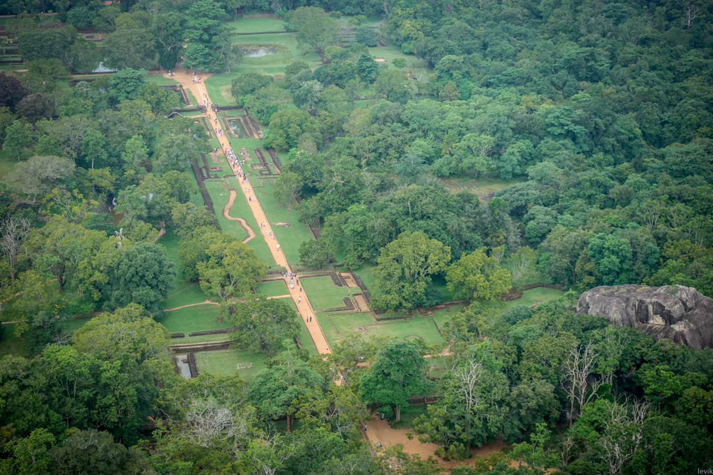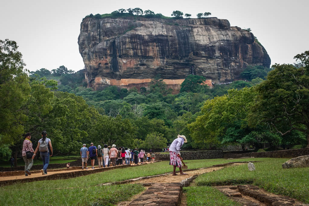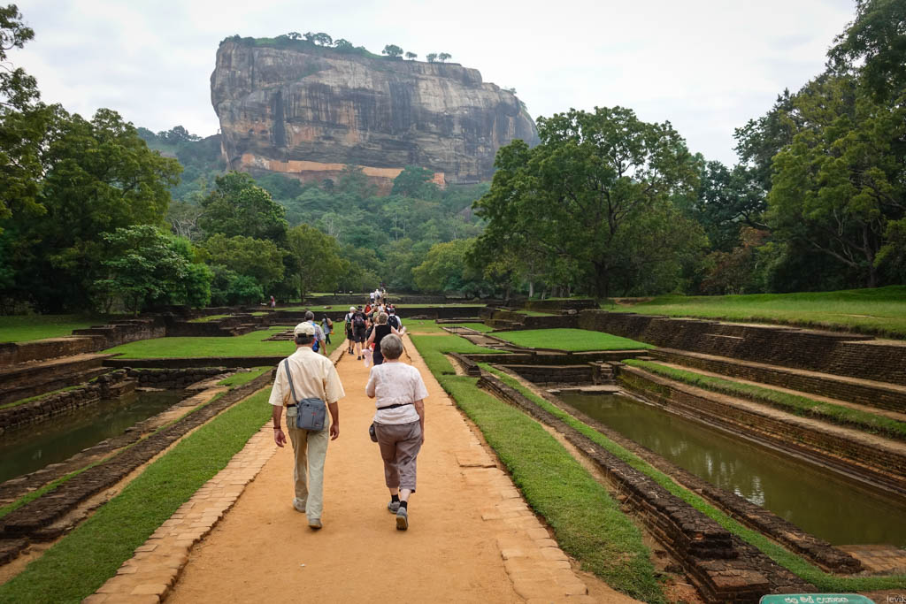 Дорога к скале идёт через древние сады Кашьяпы. Здесь всё сделано в форме прямоугольников. Персонал ухаживает за этой территорией, всё таки Сигирия внесена в список мирового наследия ЮНЕСКО. Газоны здесь аккуратно пострижены, а тропинки постоянно подметают.