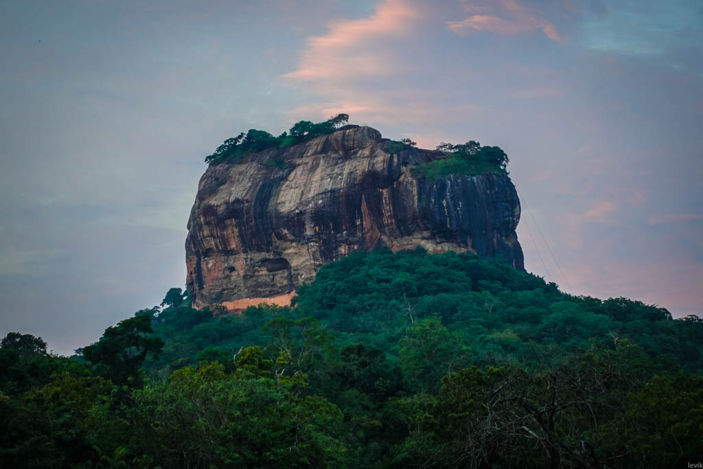 3. Я приехал в Сигирию на закате своего второго дня поездки, за несколько минут до того, как стемнело. Это как раз был день независимости - Шри-Ланка праздновала 70-летие. Львиная Скала драматично высилась из зелёных джунглей на фоне закатного неба.