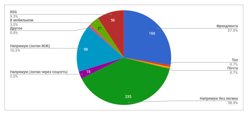 Так вот, несмотря на мои ожидания, оказалось, что Френдлентой пользуются чуть больше четверти моих читателей, а вот напрямую заходят больше половины. Я думал, что доля френдлентников будет значительно выше. Год назад количество читающих через ленту было намного выше.