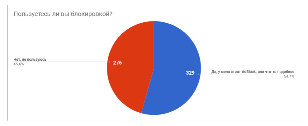 Ещё мне хотелось знать, как много из вас пользуются блокировкой рекламы. Тут та же ситуация - все блокировщики не могут себе представить, что кто-то в наше время может выходить на просторы интернета без этой защиты. Я вот например не пользуюсь Ад-блоком - ровно как почти половина из вас: