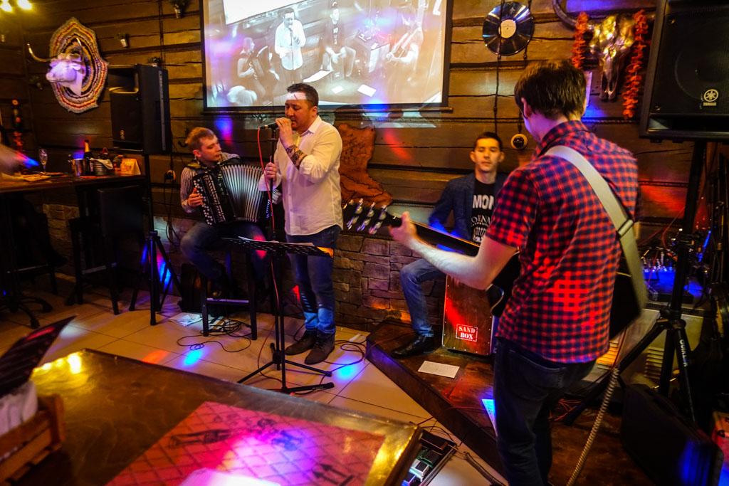 31. Зашли мы в один из ресторанов поужинать. Нам предложили выбрать первый или второй этаж: "На первом у нас будет живая музыка." Мы выбрали второй. Но оказалось, что отличаная стерео-система передаёт живую музыку и туда. Вскоре помещение заполнилось звуками хитов поздних 80х и ранних 90х. Как будто я не уезжал никуда из СССР! Никогда не думал, что песню Белые Розы можно ещё опошлить, но этим ребятам удалось (солист во все паузы добавлял "давай, давай!"). Я даже спустился чтоб их сфотографировать.
