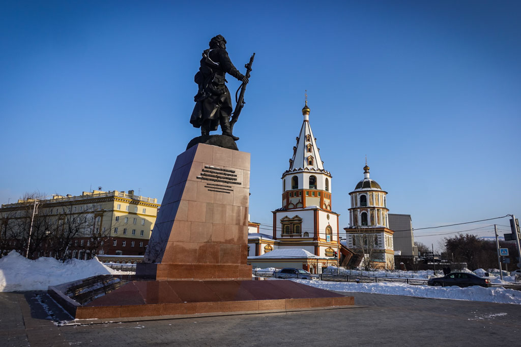 16. Напротив собора, на набережной реки Ангара, стоит памятник Якову Похабову, который считается основателем Иркутска.