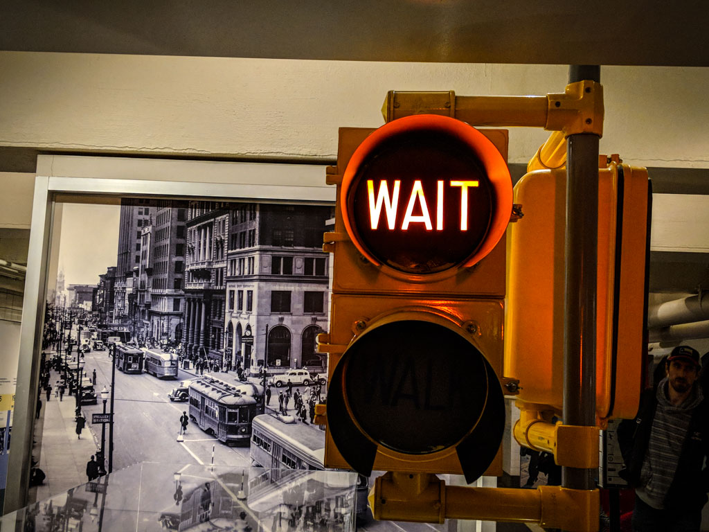 26. Мне конечно метро было наиболее интересным, но в музее есть немало экспонатов связанных с другими видами транспорта. Например вот старый городской светофор, где на красный вместо "Стоп" было написано "Wait" ("Подождите").