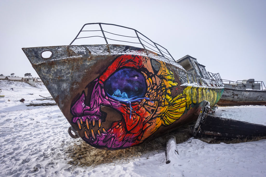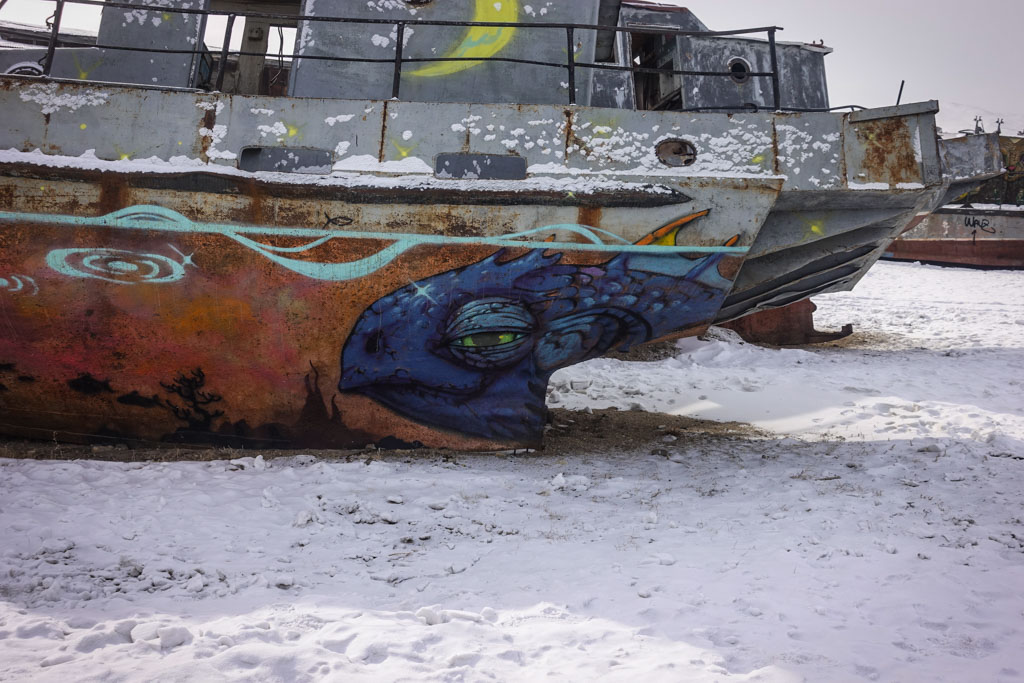7. Кто-то пришёл с баллоном и покрыл ржавые тушки этих судов красочными рисунками. Кое-где зияющие дыры иллюминаторов превратились в пустые глазницы...