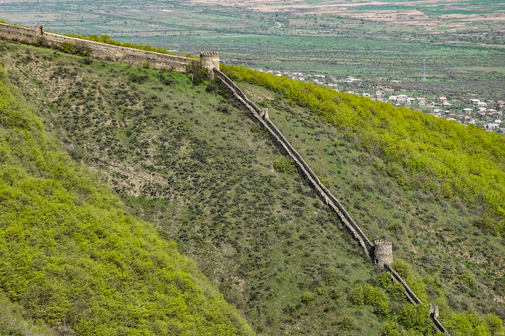 2. Пожалуй, главная достопримечательность Сигнахи - старые крепостные стены, построенные в 1762 по приказу грузинского царя Ираклия II. Тогда и был основан нынешний город, хотя человеческие поселения существовали в этих местах ещё с эпохи палеолита. Крепость должна была послужить защитой от атак дагестанских племён с севера. Её стены на удивление хорошо сохранились эти 250 лет, и живописно вьются по зелёным холмам окружающим город. На всём протяжении сооружены круглые сторожевые башни, которые тоже неплохо сохранились.