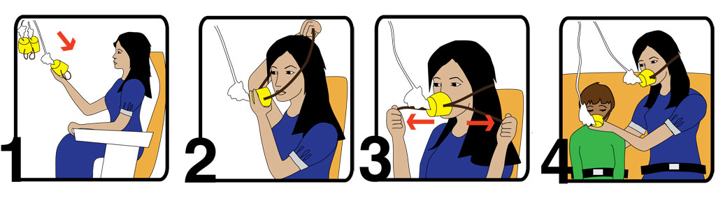Все мы видели демонстрации этих штук во время руления самолёта в сторону взлётной полосы. Некоторые может разглядывали абстрактные иллюстрации на карточке безопасности, в кармашке сидения. Однако вряд ли многим доводилось видеть эти маски живьём. Я вот летаю куда-нибудь довольно часто: у меня около сорока перелётов за прошлый год. Но я признаюсь, что ни разу не видел, свешивающиеся с потолка кислородные маски.