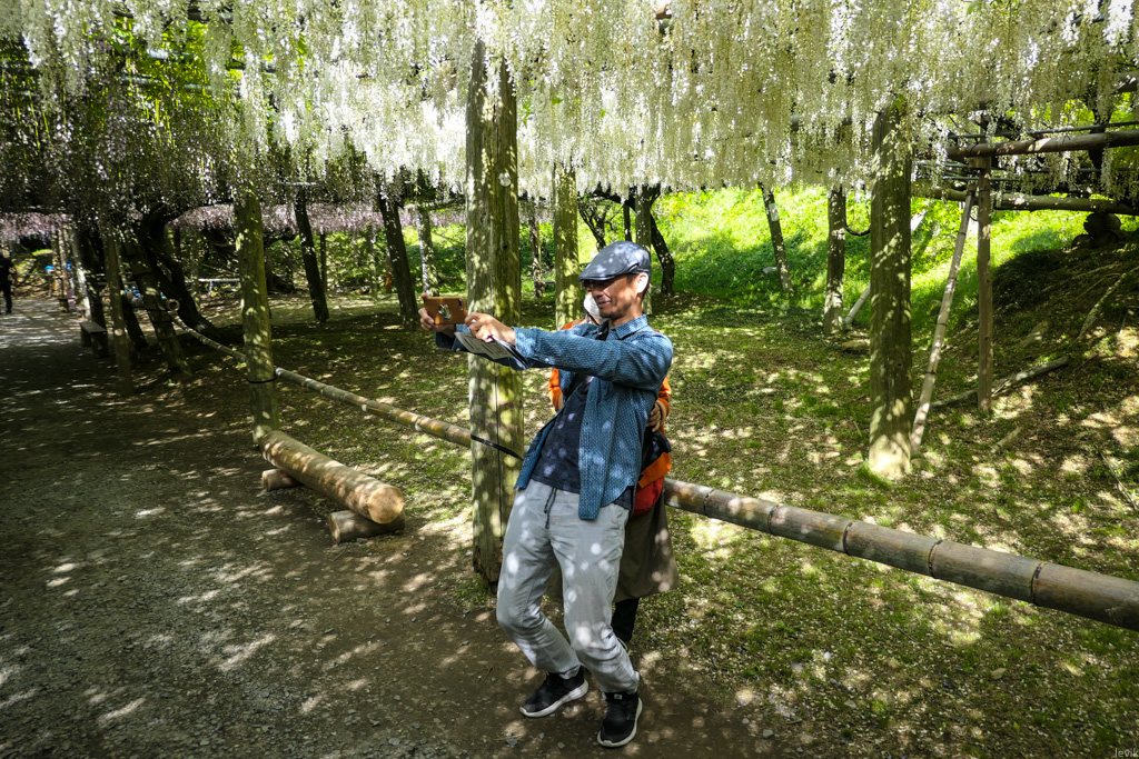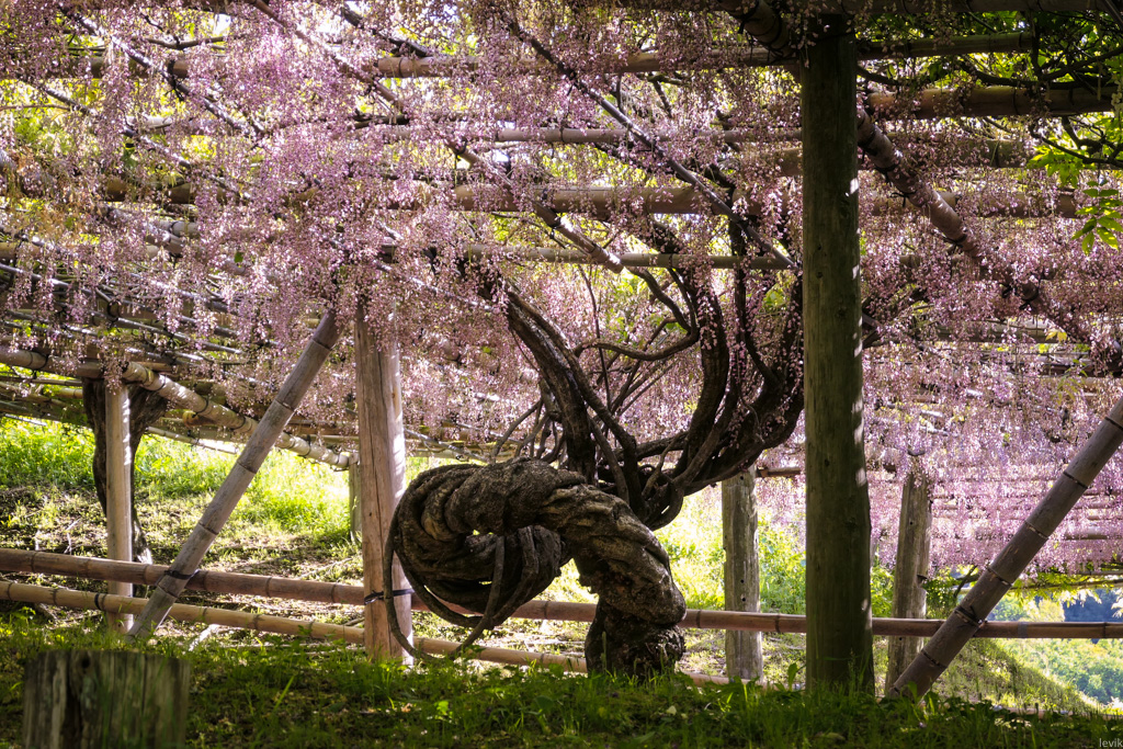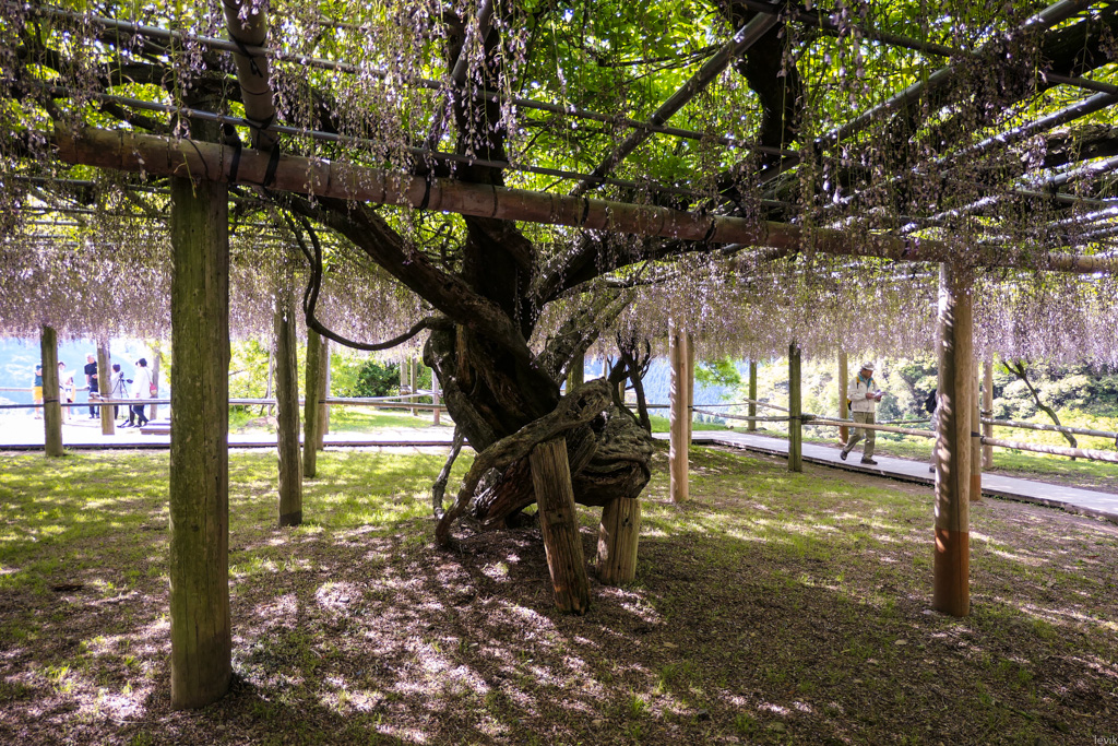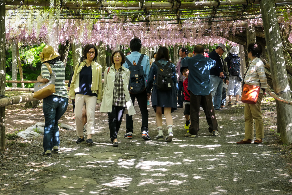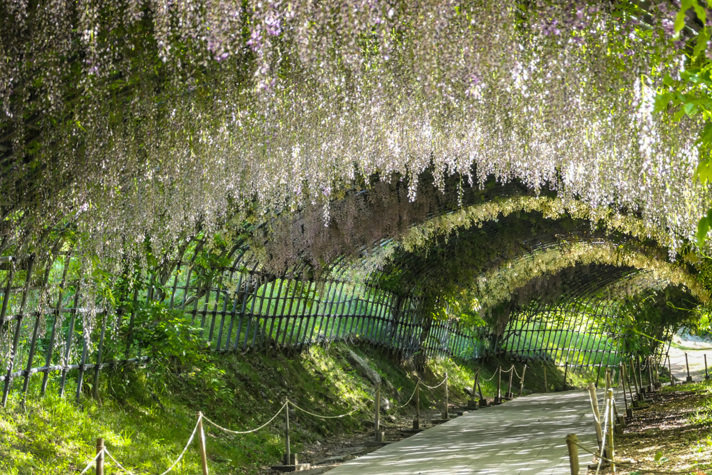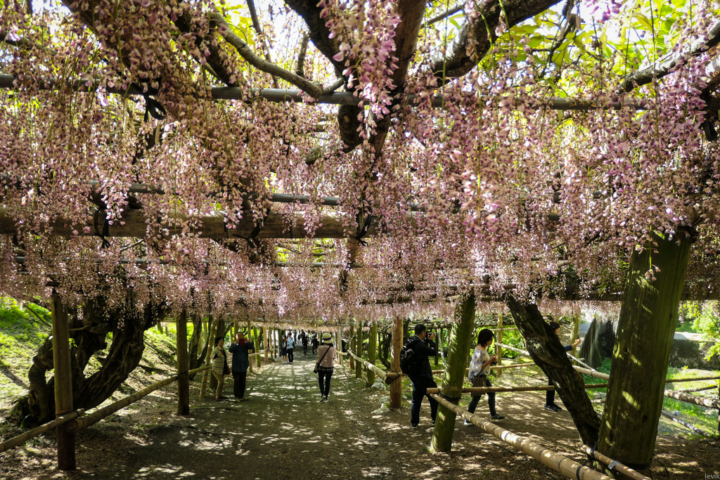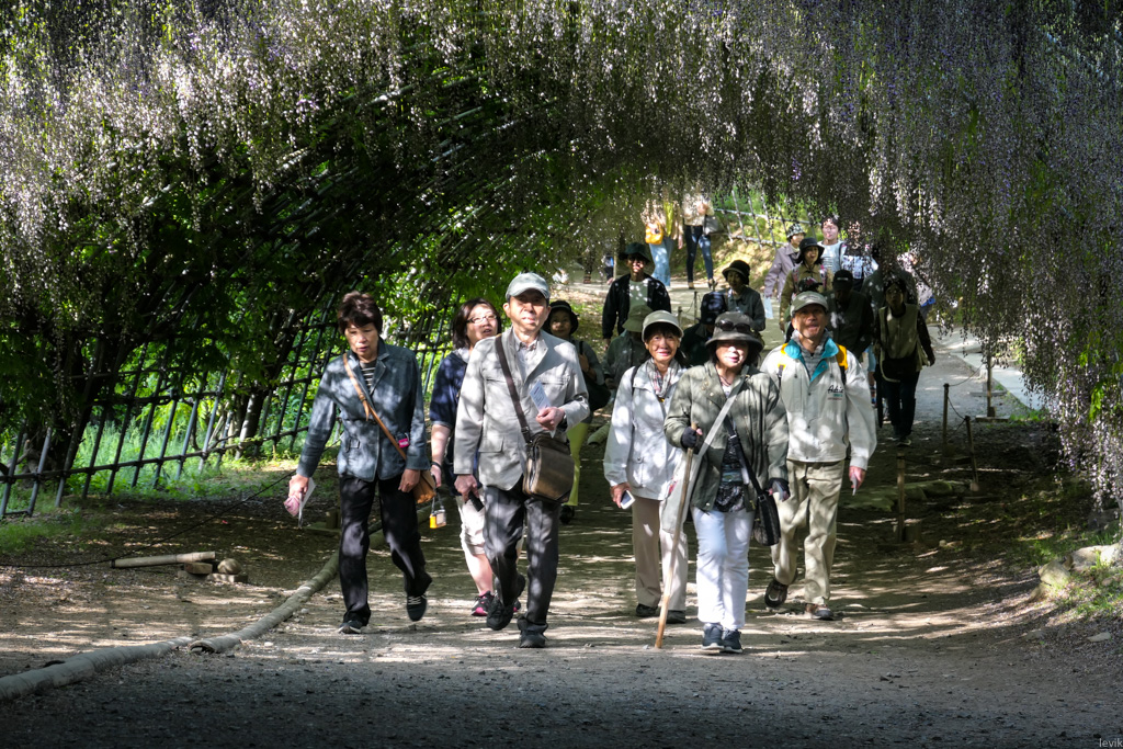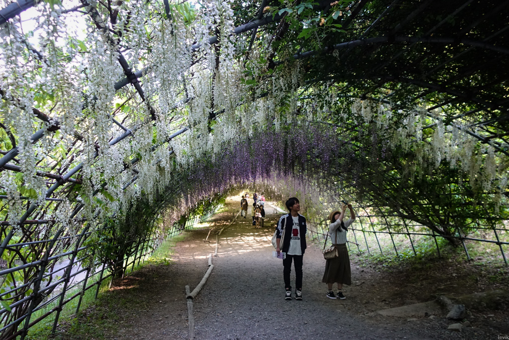 17. Кстати, таких туннелей в парке Кавати Фудзи несколько. Своды сделаны из металлических труб, по которым ползут ветки деревьев. Видно, что садовники специально чередуют породы глициний, чтоб получался эффект полосок.