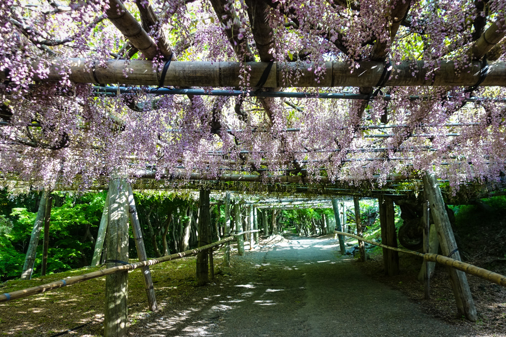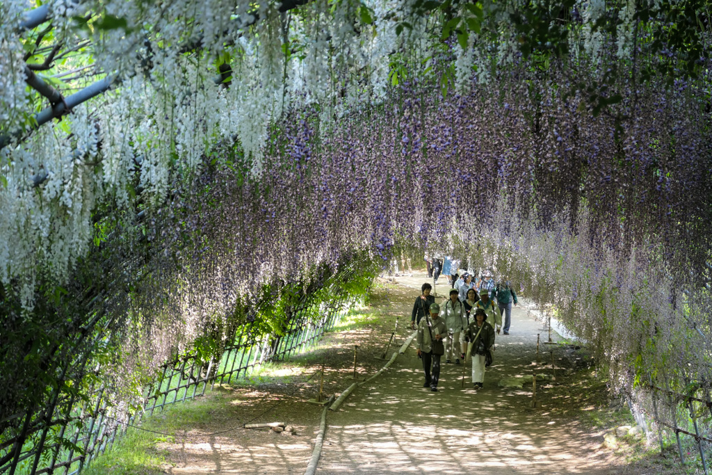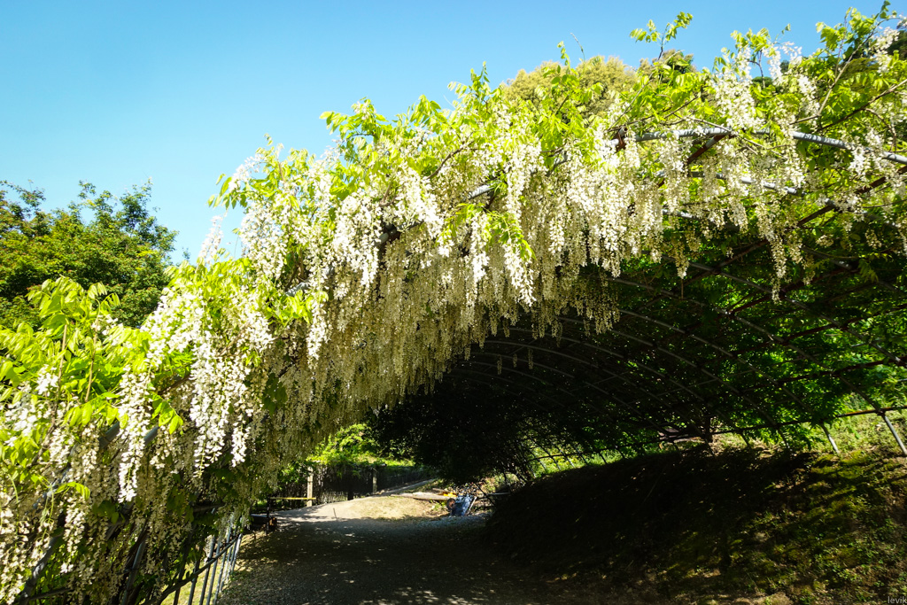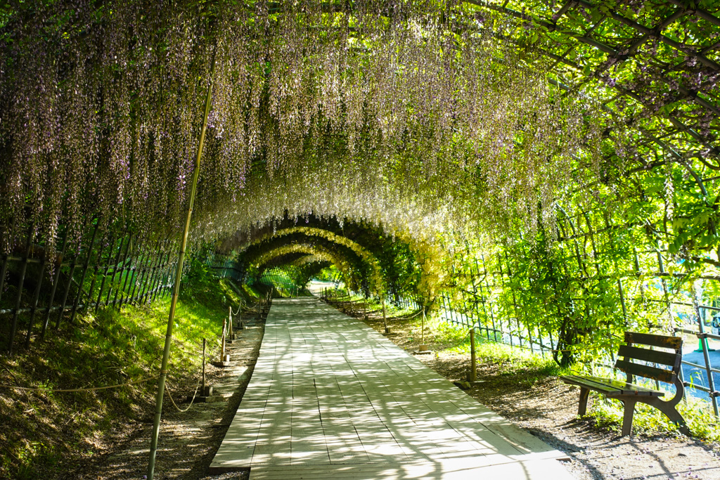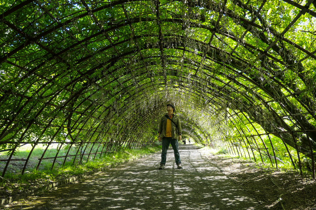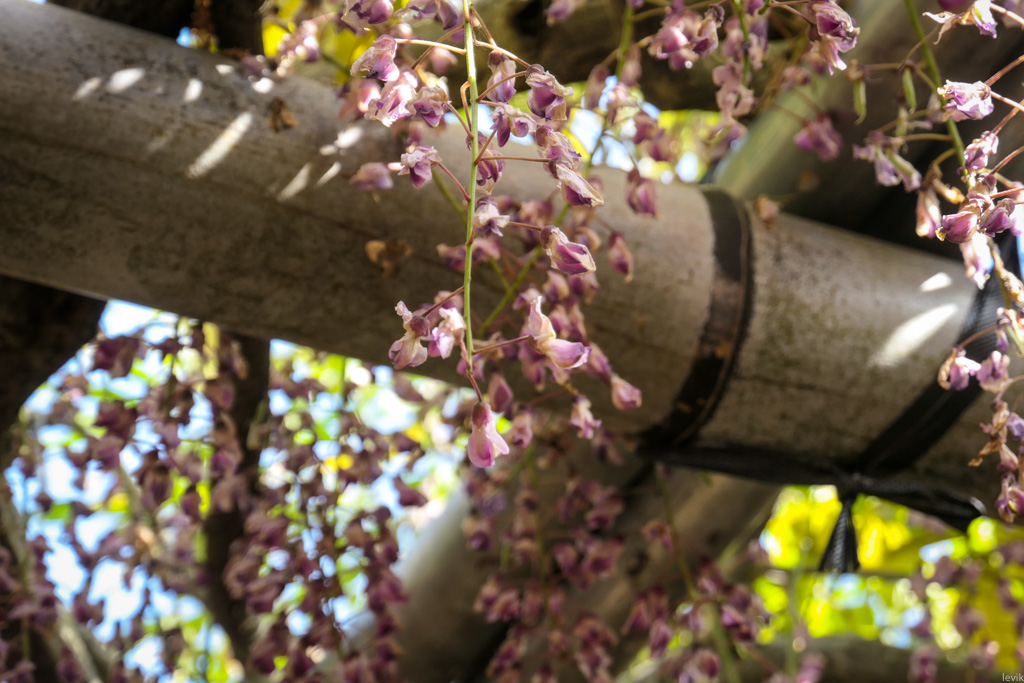 11. Ну что, вот он, момент истины! Тот самый туннель цветов, который я много раз видел в сетевых фотографиях, предстаёт передо мной во всей красе. Вернее, краса уже явно не вся. Видно, что её было больше. Цветочки глицинии всё ещё свешиваются с полукруглого свода, но выглядят они уже как-то жалковато.