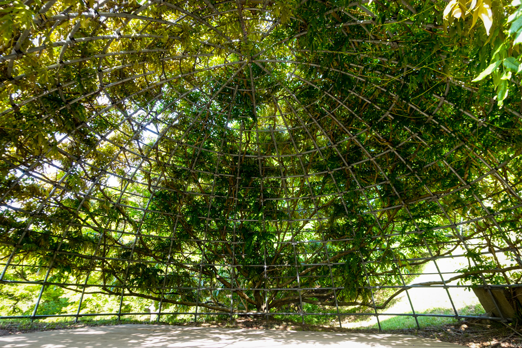 28. Для поддержки ветвей над землёй натянута решётка из труб, получается натуральный навес, под которым проходит много дорожек.