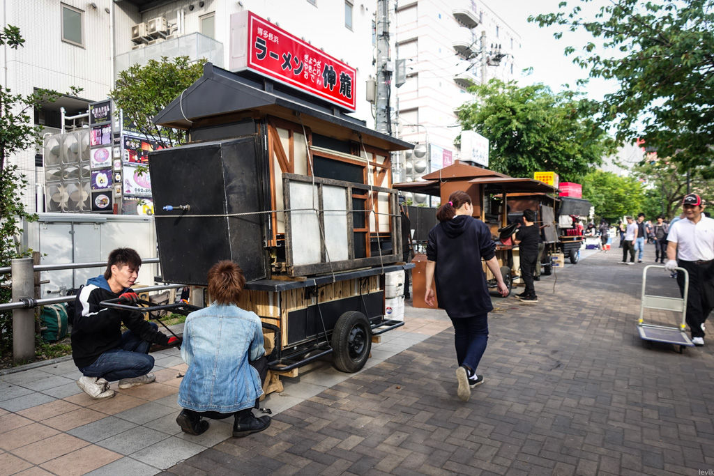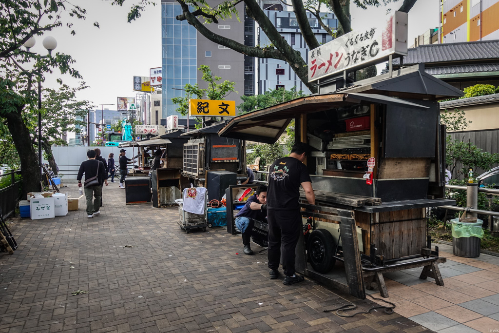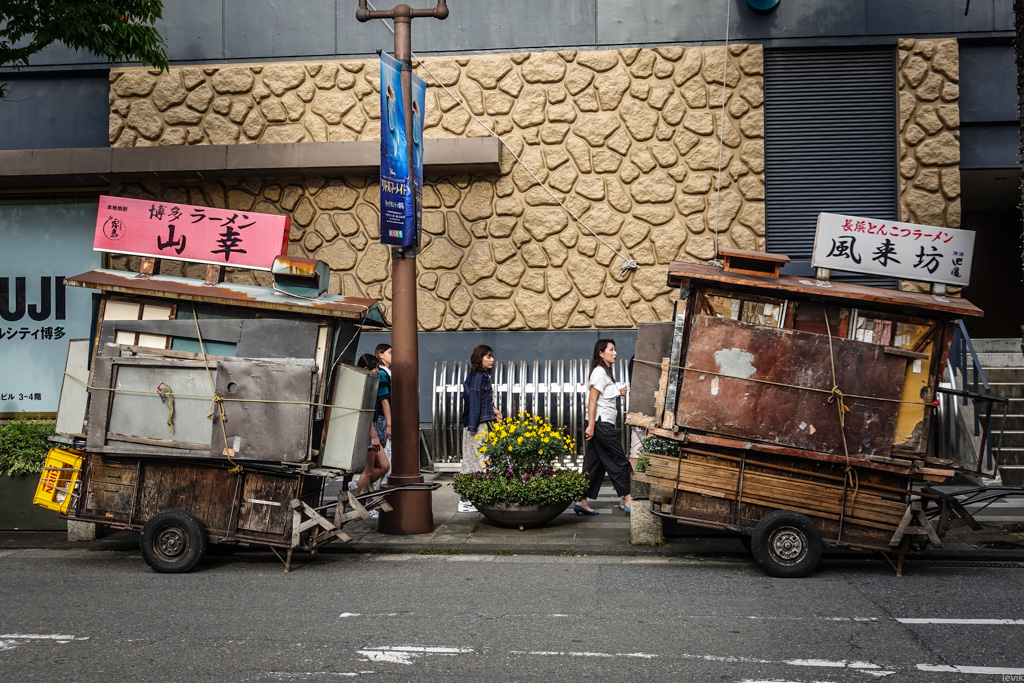 1. Ятай в Фукуоке - дело вечернее. Днём лотки стоят на улицах города в собранном виде. Они чем-то напоминают тележку героев из мультфильма Бременские Музыканты.