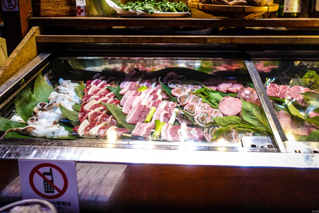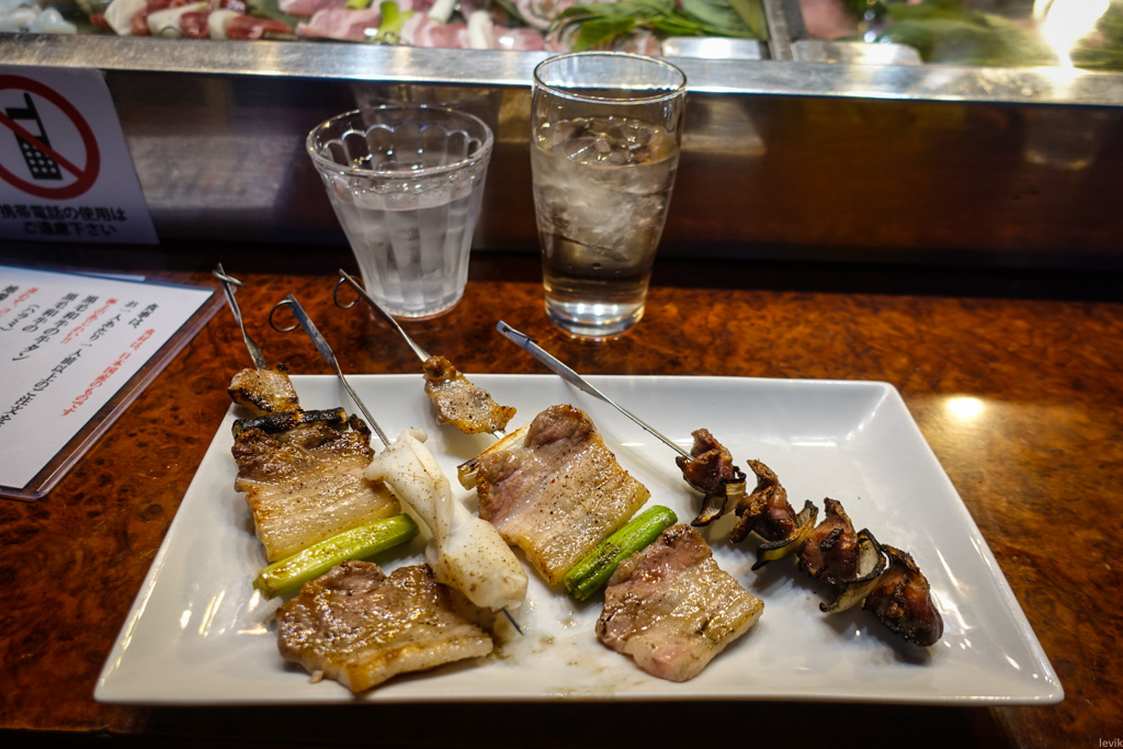 7. Специализации у таких заведений самые разные. Я вот приткнулся к одному, где жарят мясо на палочках. Всё меню на виду - можно ткнуть пальцем "вот этого", и сразу пальцами же показать "две штучки". Очень удобно для гайдзина, который по нихонго совсем-совсем ханашимасен.