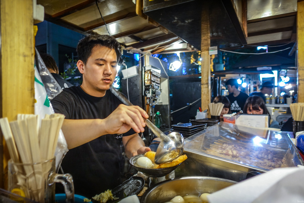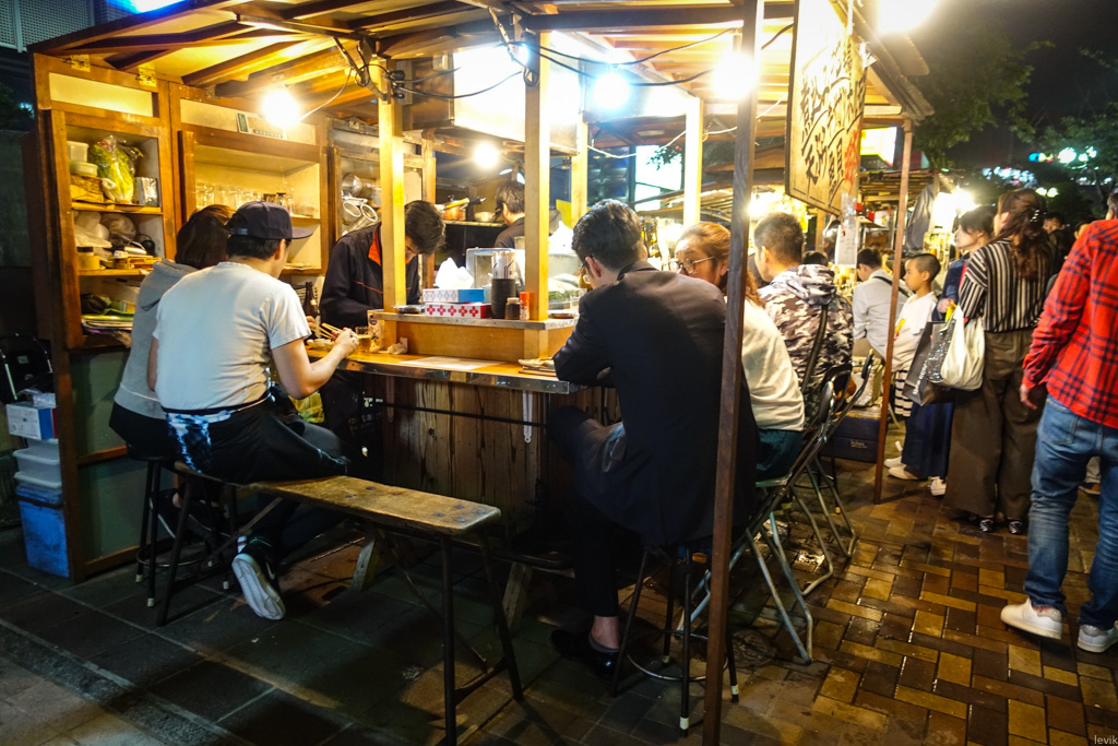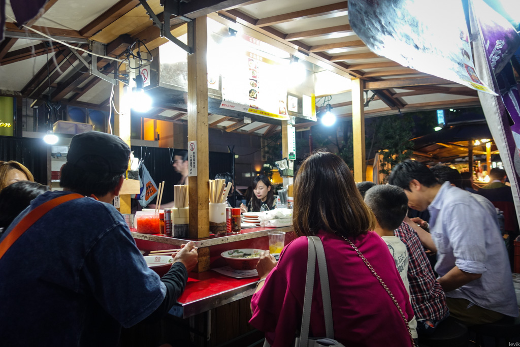 11. В этих подвижных киосках народ сидит очень компактно, места немного, атмосфера шумная, весёлая - чем-то напоминает Голден Гай в токийском Синдзюку, правда там больше по спиртному.