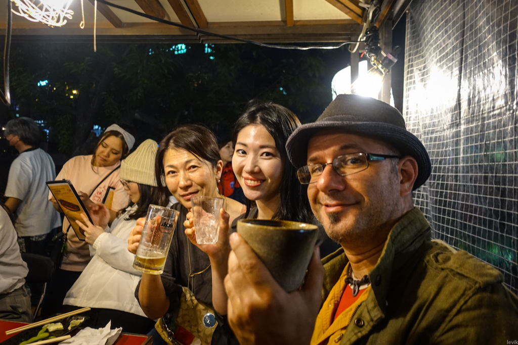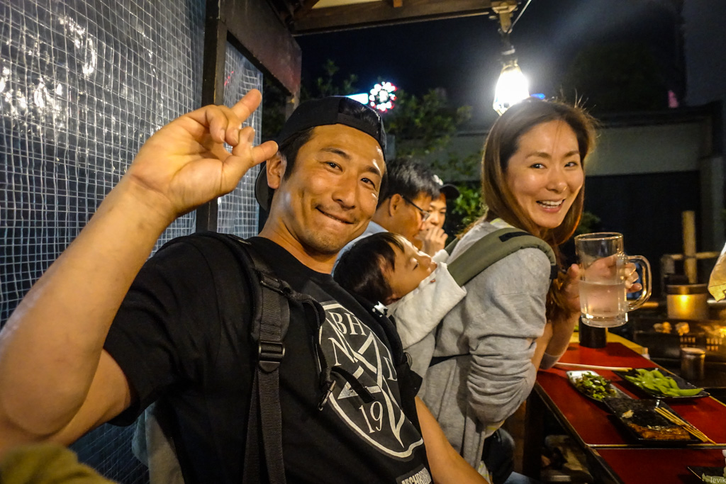 12. Так или иначе, после пары выпитых стаканчиков, довольно быстро начинаешь болтать с соседями по прилавку. Обязательно окажется, что кто-нибудь из них помнит хоть пару английских слов со школы, а если вдруг окажется, что вы знаете как сказать какую-нибудь фразу по-японски - это непременно приведёт их в неподдельный восторг. Вот эта парочка например пришла со своим ака-чаном, который мирно спал за спиной мамы, пока родители весело рассказывали мне как они специально приехали из Сидзуоки (больше 900км!) чтоб попробовать местных ятай-деликатесов.
