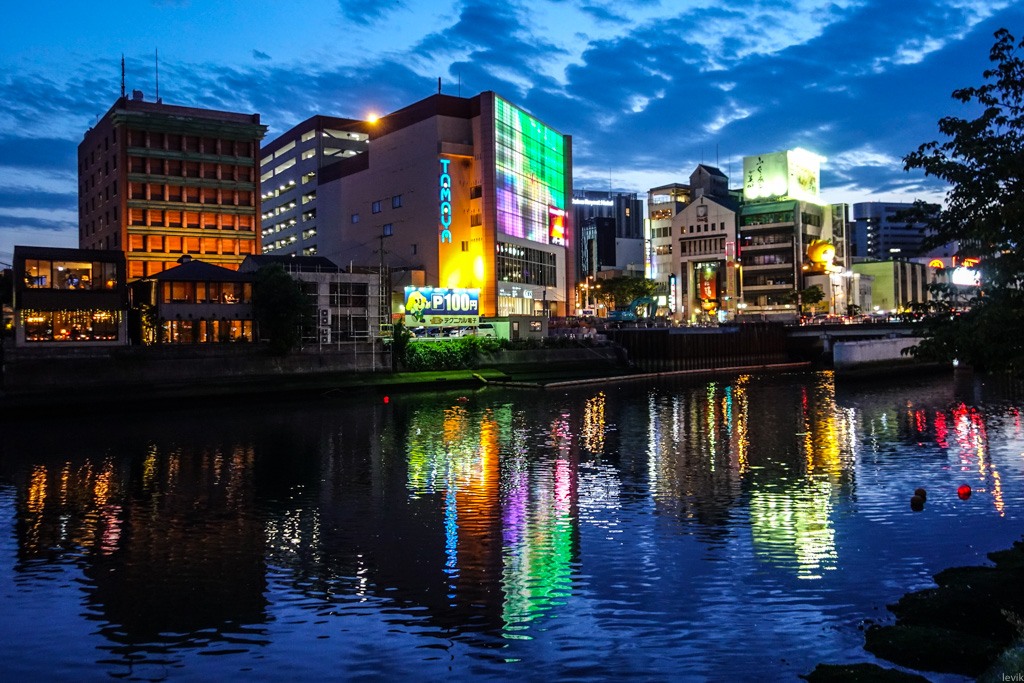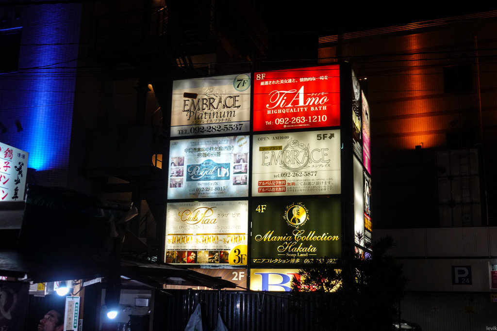 19. Кстати, как оказалось, прямо за набережной находится квартал красных фонарей, крупнейший в западной Японии после Осаки. Там сплошь и рядом заведения с наводящими названиями и женскими силуэтами на вывесках.
