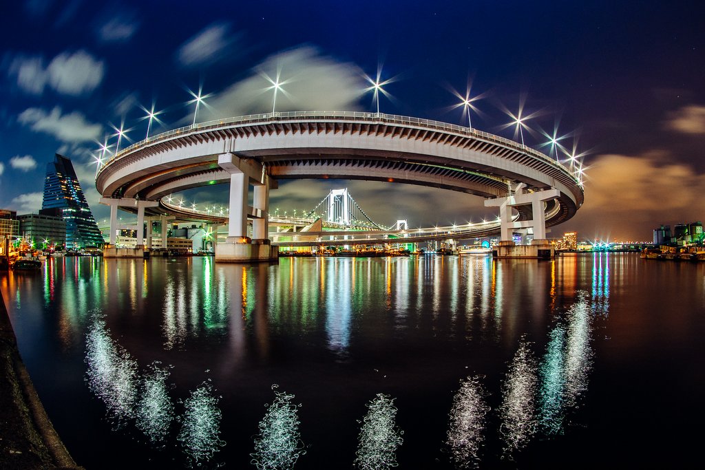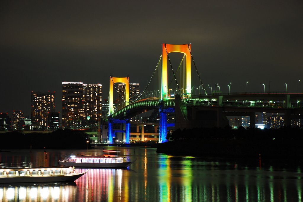 Чтобы попасть на Одайбу, Юрикамомэ пересекает изящный Радужный Мост. К сожалению он едет по нижнему уровню, и во время этого переезда виды по сторонам не очень хорошие. Зато, перед тем как въехать на сам мост из основного Токио, поезд выделывает петлю в 270 градусов, во время которой предоставляет пассажирам отличный вид на эту структуру. Эта петля - хороший повод поехать на Одайбу именно используя Юрикамомэ, несмотря на то, что существует и более дешёвый (и быстрый) вариант.
