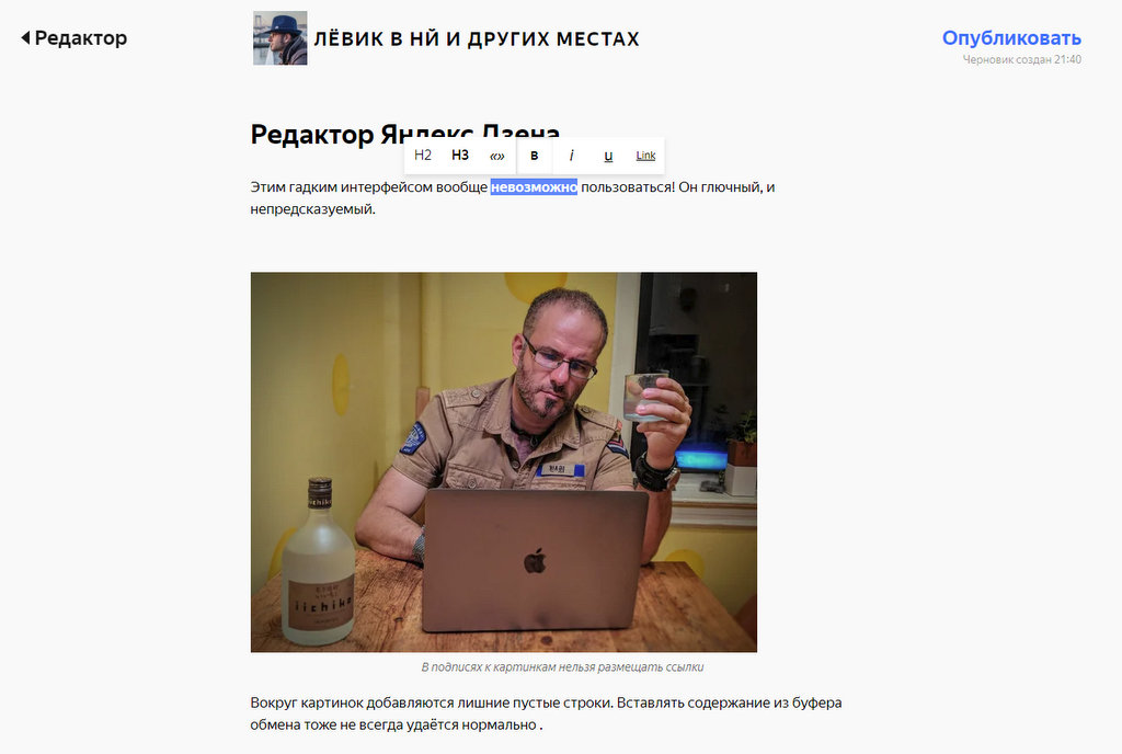 Пожалуй самый главный изъян площадки Яндекса - это очень корявый редактор. Он вроде как минималистичен, и старается представлять текст таким, какой он будет в конечной статье.Мало того, что он не умеет вставлять картинки в обтекающий текст, запрещает делать ссылки в картинках или подписях к ним, и много чего ещё не умеет. Но ведь он ко всему ещё и невероятно глючный, постоянно коверкает форматирование, добавляет лишние пустые строчки, и сильно меняет вставленный из буфера обмена текст, который потом надо вручную править.