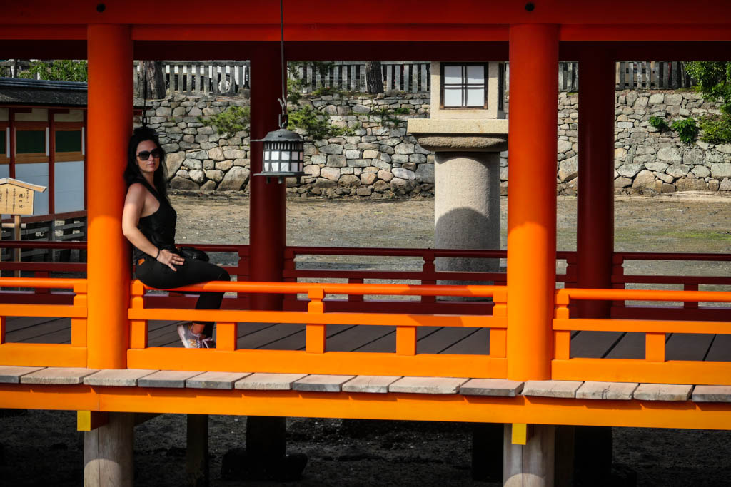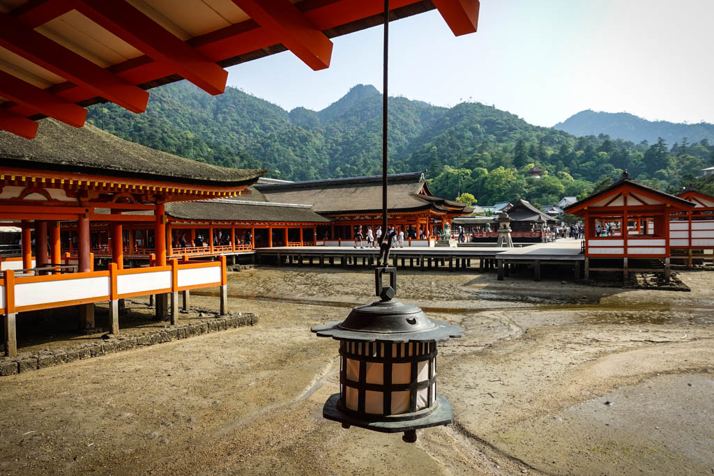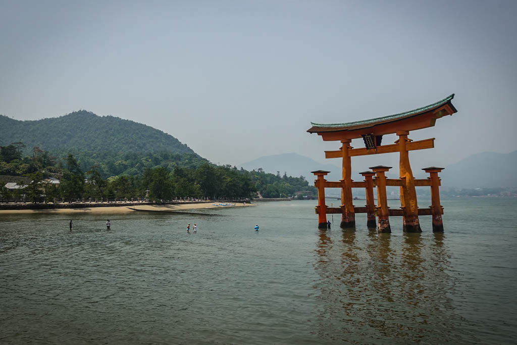 43. Спустились назад к берегу. Пока мы гуляли, наступил отлив, вода ушла, и теперь видно, что святилище Ицукусима стоит не только на сваях, но ещё и на особом фундаменте, который просто затапливает водой.