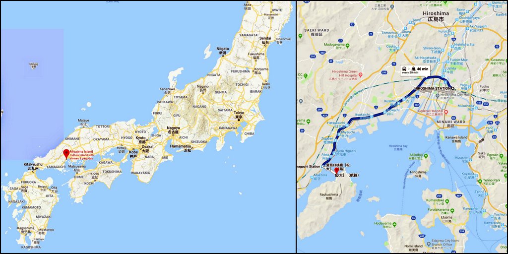 1. Миядзима - не официальное название острова. По-настоящему он называется Ицукусима. Так же называется и святилище, которое на нём расположено. Однако, "миядзима" значит "остров святилища", и это название прижилось в народе. Но оба правильные, так что не перепутайте. Остров находится на западе Японии, недалеко от Хиросимы - той самой, на которую сбросили атомную бомбу. Добраться сюда от центрального вокзала Хиросимы можно меньше чем за час.