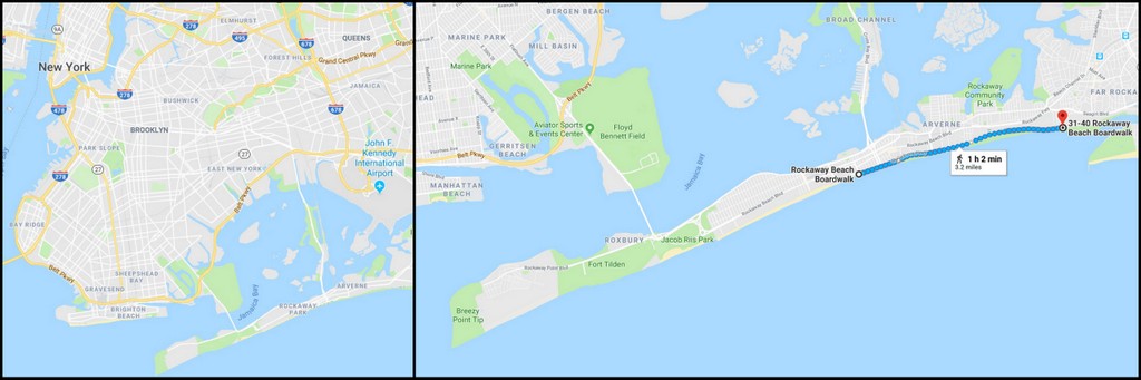 Вот карта Рокавея в отношении к Бруклину, и более крупным планом, где помечен наш маршрут вдоль пляжного променада.