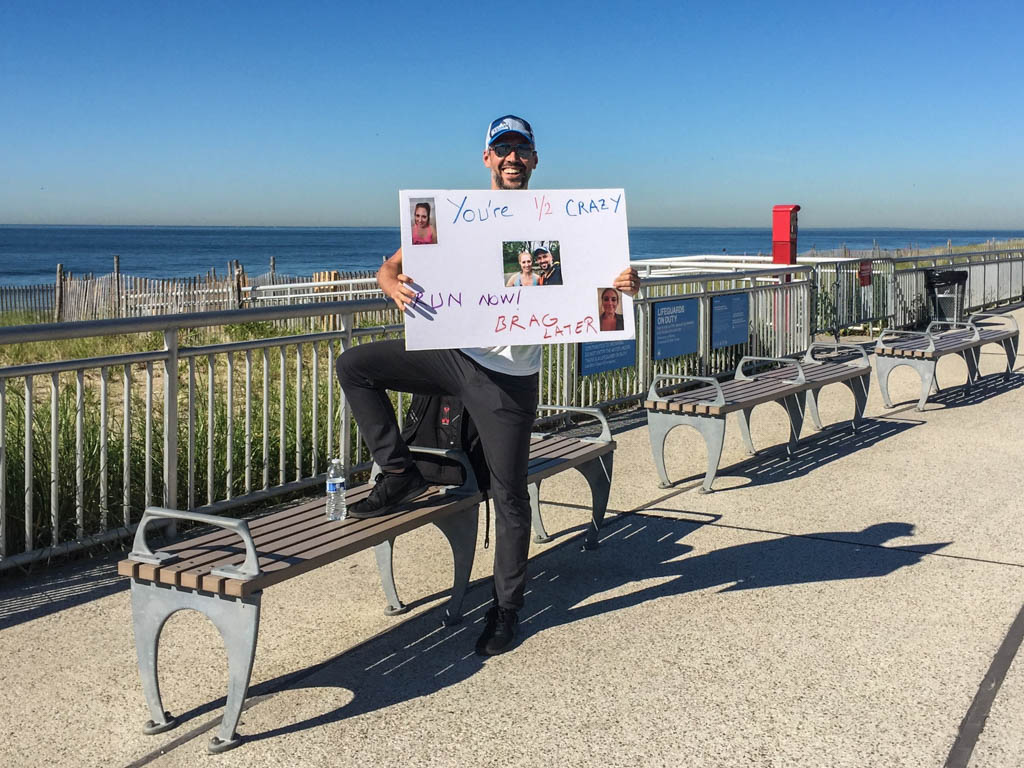 Кто-то, зная, что сегодня бегут полумарафон вышел с табличкой подбадривающей бегунов (возможно, он ждал там конкретных бегунов, но его надпись радовала всех). "Вы наполовину сошли с ума. Бегите сейчас, хвастаться будете потом."