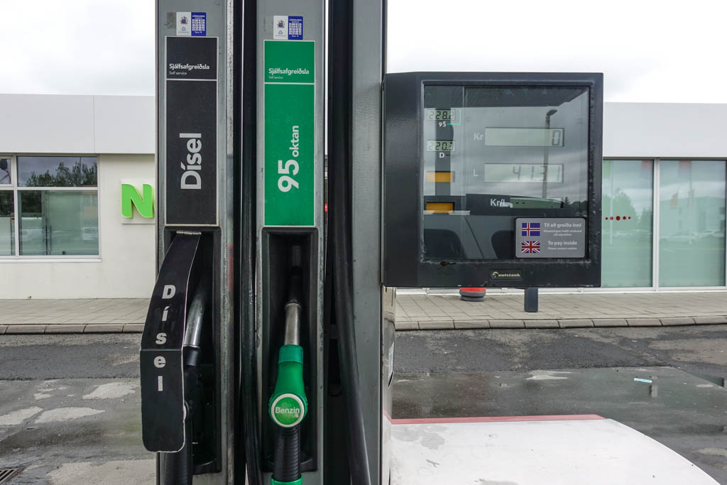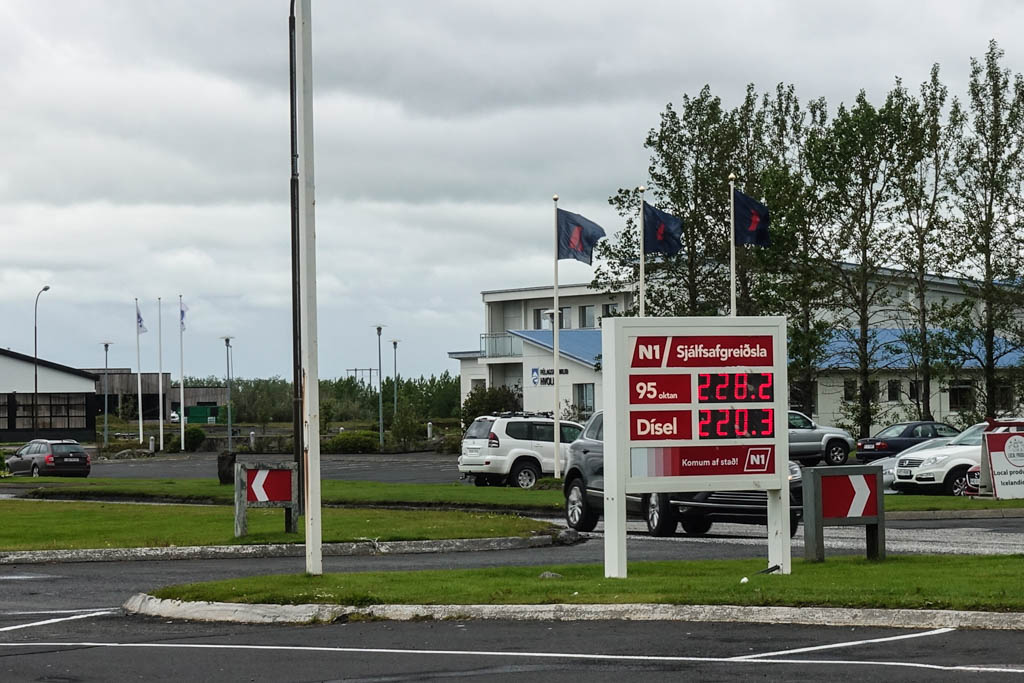 Вот обыкновенная заправка - здесь продают 95-й бензин (228 исландских крон за литр) и дизель (220 крон/л). Это много или мало?