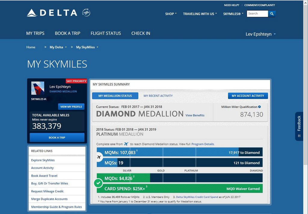 У Дельты, как и других авиакомпаний, помимо бонусных программ по накоплению миль, есть ещё разные статусные плюшки для тех, кто много летает. Чем больше ты летаешь, тем приятней тебе становится это делать. Если пролетел 25,000 миль в год, получаешь Серебряный статус. За 50,000 - Золотой. Потом Платиновый (75,000), и, наконец "Алмазный" (Diamond) за 125,000. (Тут я немного упрощаю, есть другие требования, и один "секретный" уровень статуса, которого просто так не достичь.) Каждый новый уровень предоставляет всё больше и больше льгот, позволяет зарабатывать больше миль, меньше стоять в очередях, а главное, чаще летать бизнес-классом не выкладывая за это тысячи долларов.