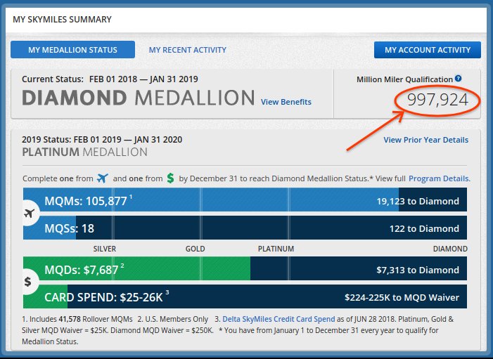 Но кроме статуса, который надо закреплять каждый год, есть ещё программа Million Miler - для клиентов которые много летают много лет подряд. Бонусы у них прямо скажем, так себе. После первого миллиона миль, ты получаешь "несгораемый" Серебряный статус. После второго - Золотой, после третьего... тоже Золотой! И лишь пролетев четыре миллиона миль тебе дают пожизненный Платиновый статус. (Алмазный статус закрепить за собой нельзя никак.)