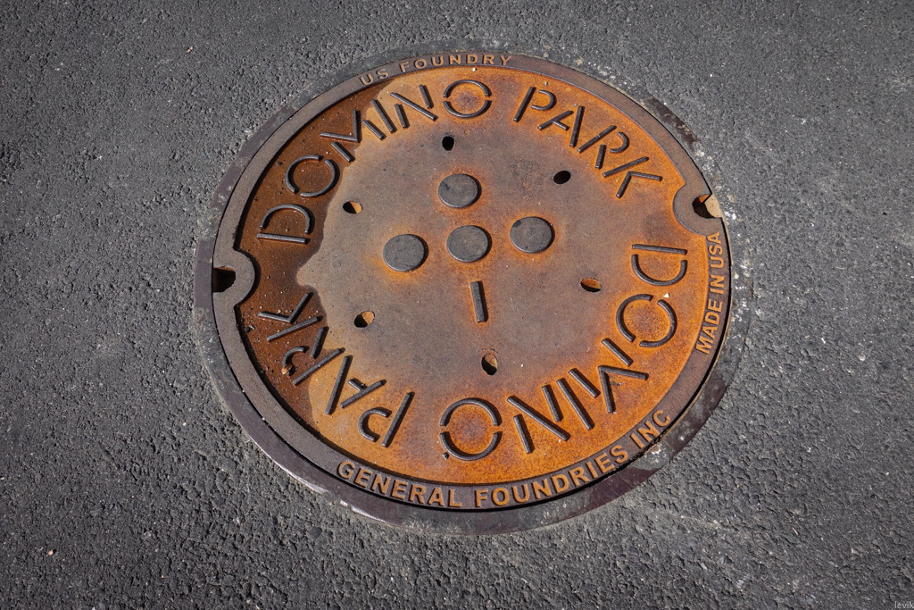 33. И люки здесь хоть и новые, уже покрыты рыжеватым налётом. Так сейчас модно. Кстати, у всех крышек люков в Домино-парке свой дизайн, пусть и не такой изощрённый, как в той же Японии, но всё равно это радует глаз. А ещё, в отличии от многих других люков Нью Йорка, которые почему-то производятся в Индии, эти были изготовлены США.