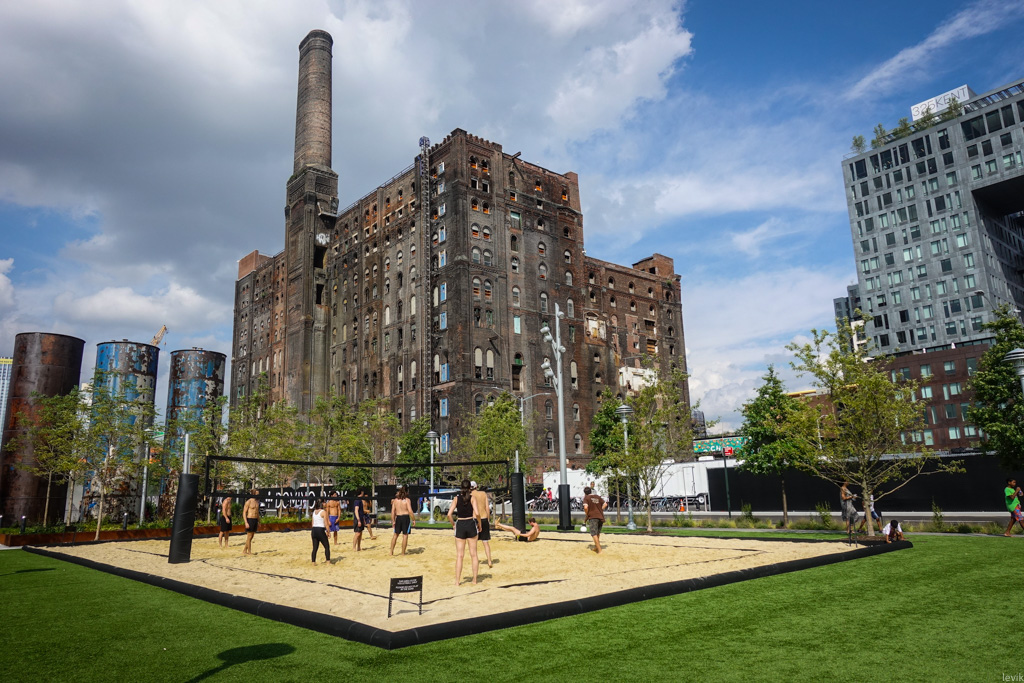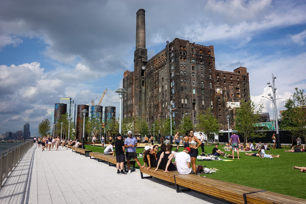 Люблю рассказывать про хороший Нью Йорк. Сегодня будет как раз такой пост. Этим летом у нас в Бруклине открыли новый парк на берегу Ист-ривер, прямо в месте, где ещё несколько лет назад были мрачные кирпичные строения заброшенного сахарного завода. Нью Йорк продолжает отвоёвывать пространства у воды у складов и заводов, и превращает их в зоны отдыха горожан. При этом, город не отворачивается от своего индустриального прошлого, а использует его для создания колоритной общественной среды.