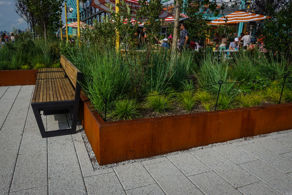 32. Такое железо "под ржавчину" используется и в элементах парка - все стенки клумб с зеленью тоже сделаны из похожего металла.