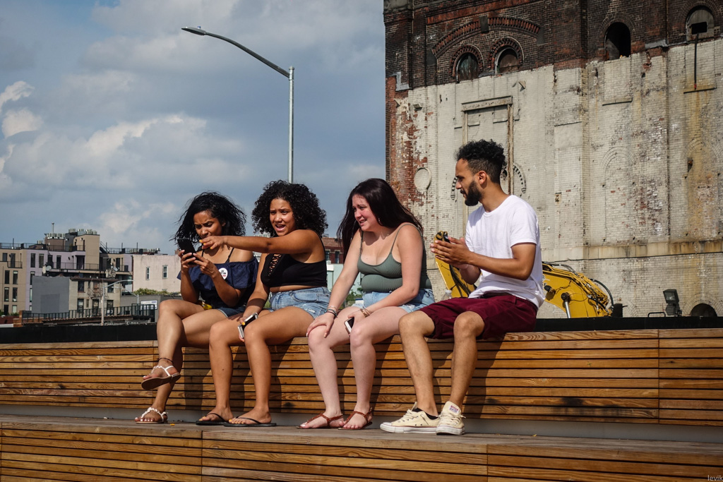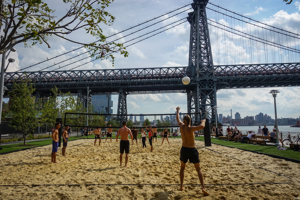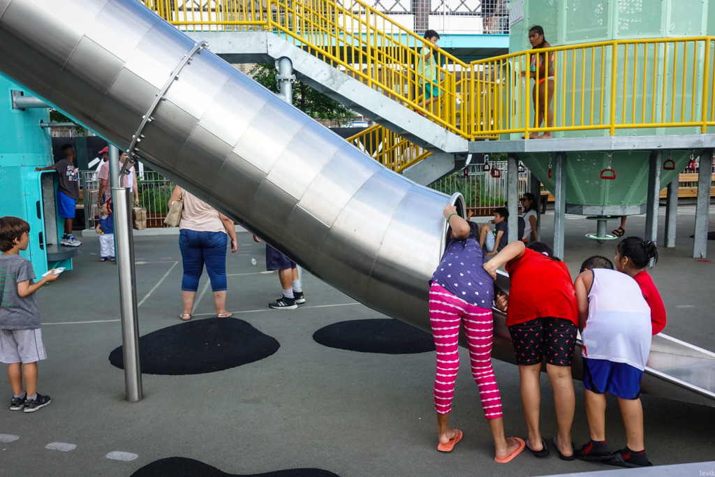 16. Ребята играют с отличным видом на соседний мост, на старый завод, и на берег Манхэттена.
