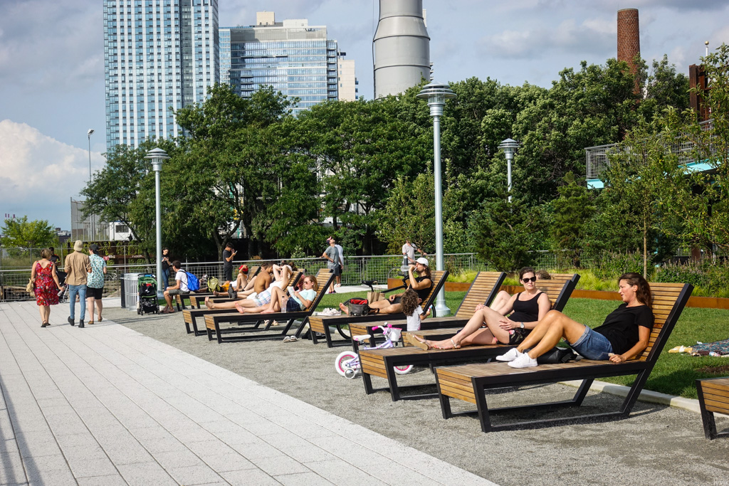 10. Развалившиеся на таких штуках посетители парка могут наслаждаться видом мидтауна на дальнем берегу реки. Безусловно, главный объект в этом городском пейзаже - всемирно известный Эмпайр Стейт Билдинг.